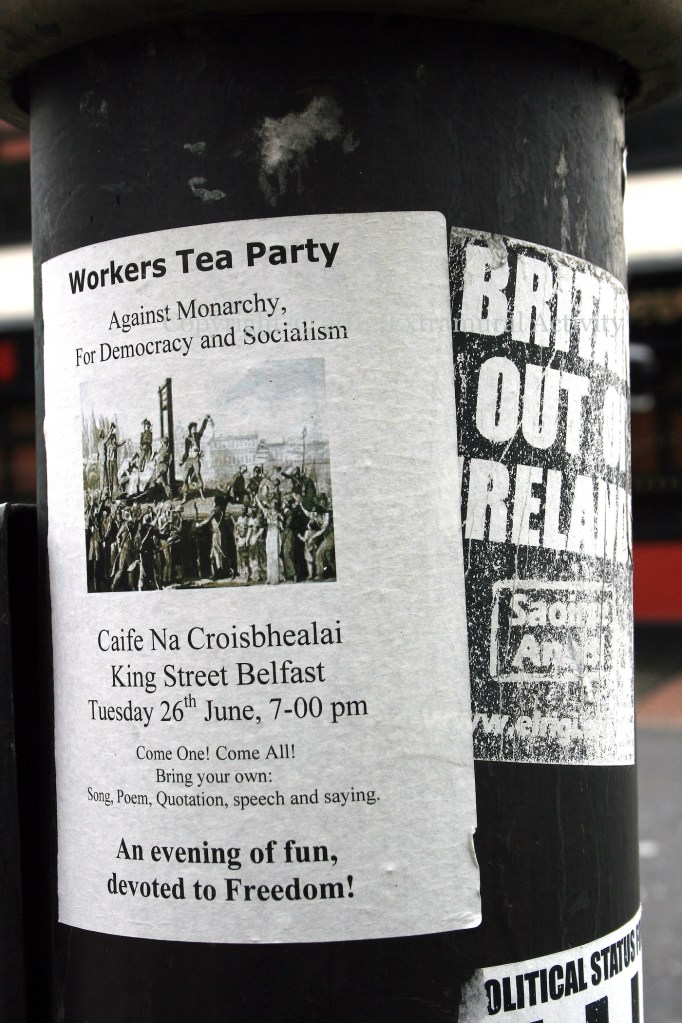 X00658 workers tea party, against monarchy for democracy and socialism an evening of fun, devoted to freedom come one come all bring your own song poem quotation speech and saying king street belfast tuesday 26th june caife na croisbhealai