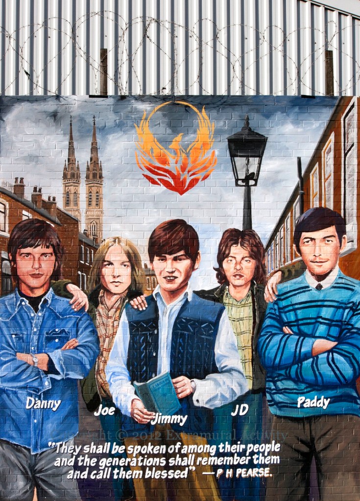 A new mural was launched on Sunday (Oct 7th, 2012) on the international wall, presenting five local (lower Falls) volunteers who died at this time forty years ago (during 1972): Daniel McAreavey, Joseph McKinney, Jimmy Quigley, John Donaghy, Patrick Maguire (real name Patrick Pendleton). Maguire, McKinney and Donaghy died together in an explosion (Oct 10); Quigley (Sept 29) and McAreavey (Oct 6) were shot. For further details of the how these five met their deaths, see among others Lost Lives by McKittrick et al. (Archive.org | Amazon UK | US). Biographies of the five begin at 7m46s in this history of D Company. Quigley holds a copy of James Connolly’s 1910 pamphlet Labour in Irish History.