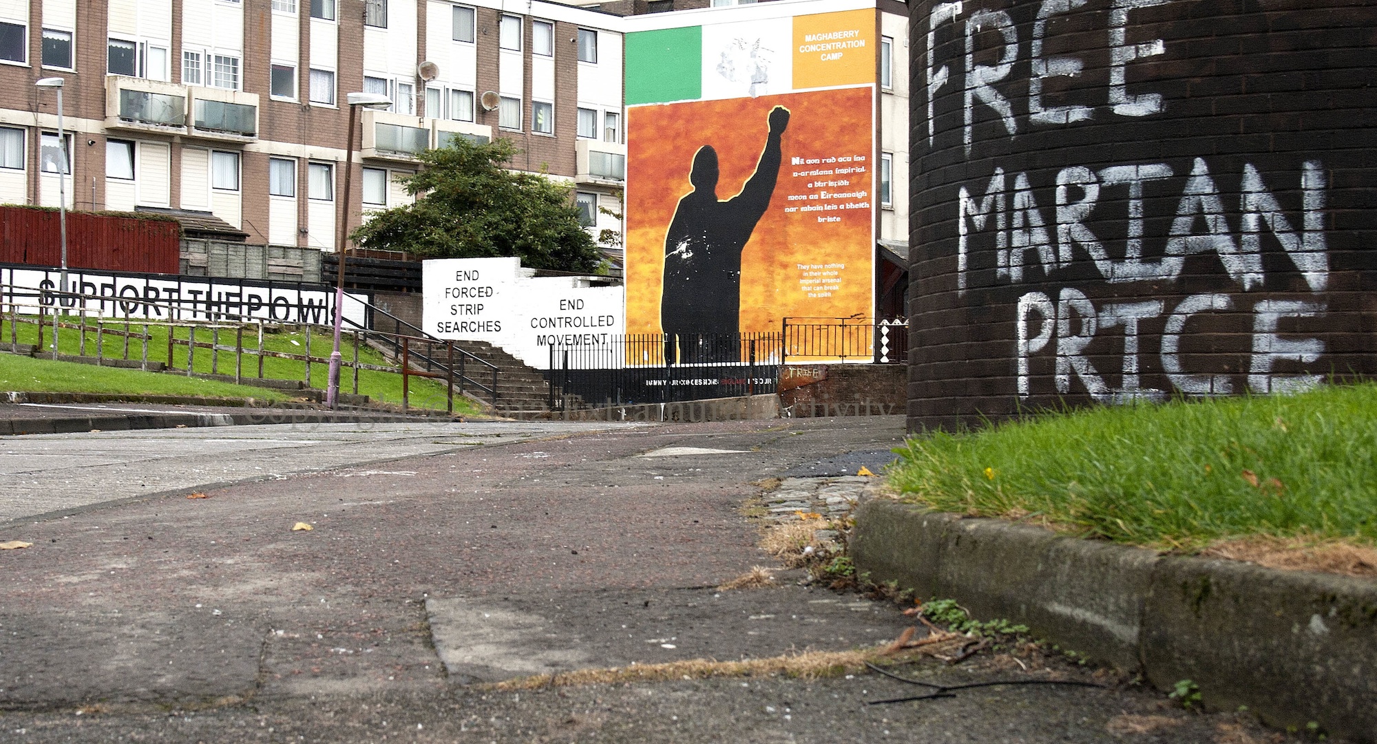 Ground-level wide shot from the New Lodge showing “Support the POWS” on the left and “Free Marian Price” on the right.