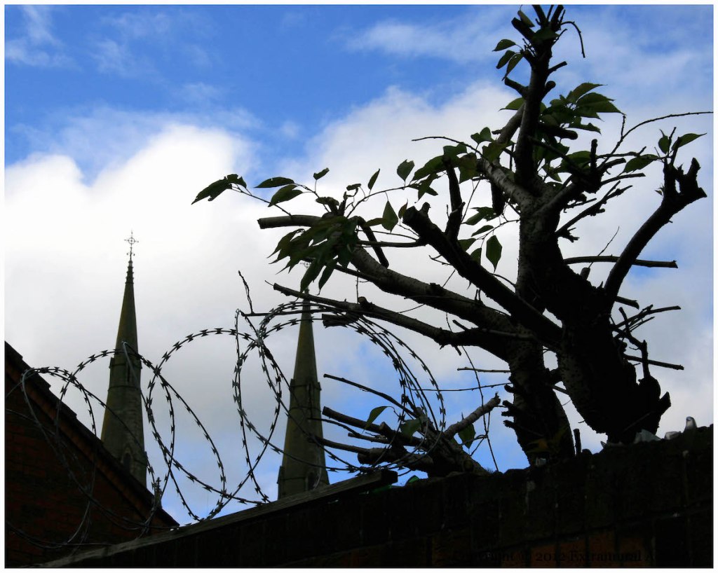 Spires & Wire 2012-10-202024-12-16Extramural Activity The spires of St. Peter’s through the barbed wire on a wall in Milford Street, off the Falls Road. See previously: Cross And Wire. Click image to enlargeCopyright © 2012 Seosamh Mac CoılleX00667 Rate ThisShare this: Click to email a link to a friend (Opens in new window) Email Click to share on Mastodon (Opens in new window) Mastodon Click to share on Reddit (Opens in new window) Reddit Click to share on Bluesky (Opens in new window) Bluesky Like Loading...
