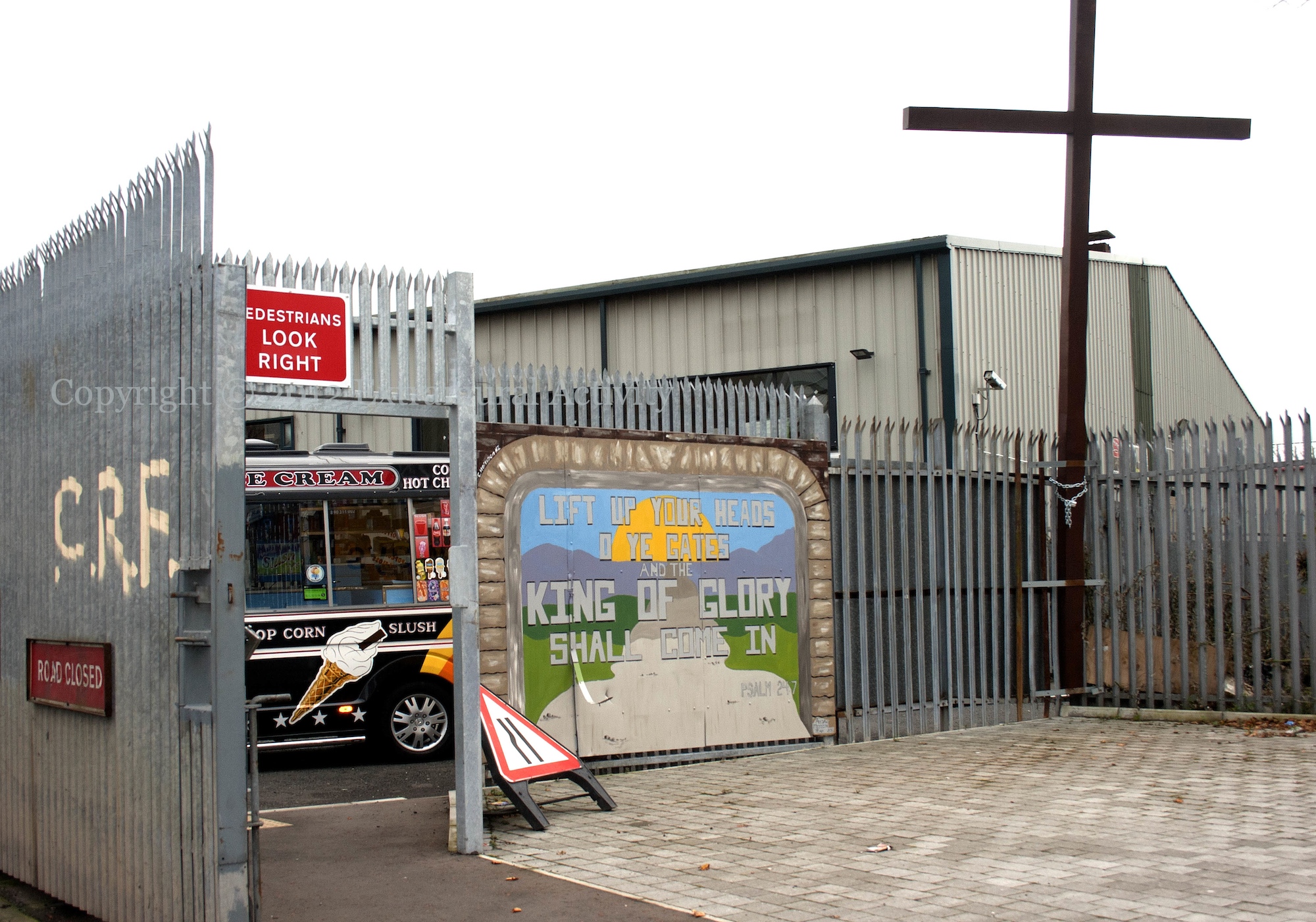 In Belfast, the gates (in the so-called “peace” lines) open up to admit various earthly pleasures and pains, as well as the king of glory. The New Life City Church at the lower gates on Northumberland Street.