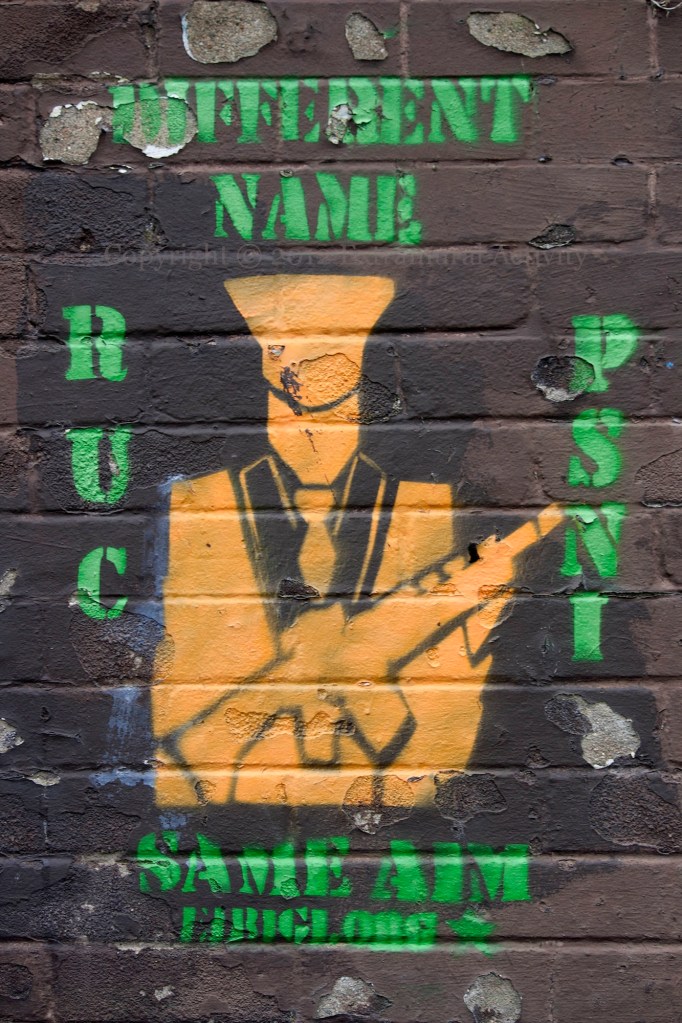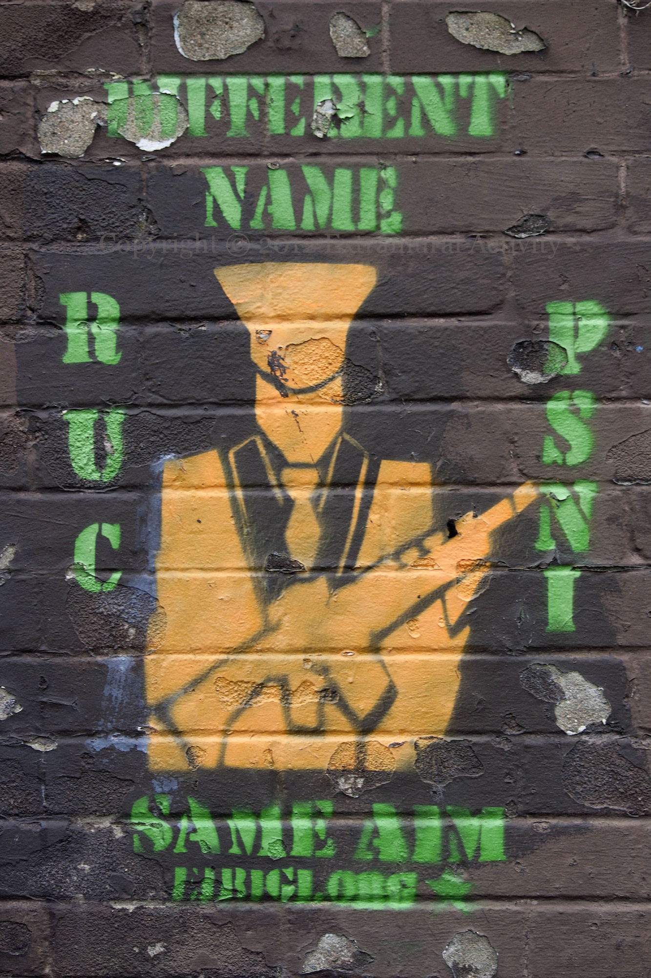 Trinity 2012-11-012024-12-16Extramural Activity Another Éırígí stencil, showing a figure with policeman’s cap, Orange Order sash, and paramilitarist’s weapon. Click image to enlargeCopyright © 2012 Seosamh Mac CoılleX00697 different name, same aim ruc psni, eirigi.org Rate ThisShare this: Click to email a link to a friend (Opens in new window) Email Click to share on Mastodon (Opens in new window) Mastodon Click to share on Reddit (Opens in new window) Reddit Click to share on Bluesky (Opens in new window) Bluesky Like Loading...