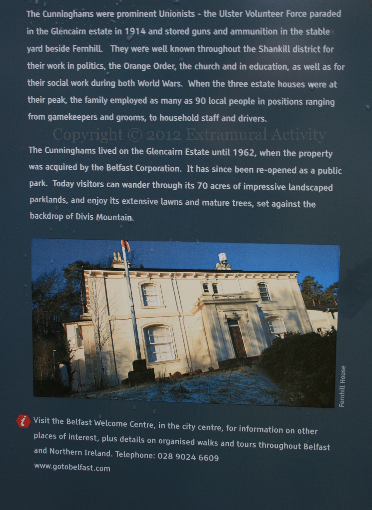 X00743 X00741 X00742 Glencairn was the former home of the Cunningham family, whose estate in north west belfast covered over 100 acres of land in the shadow of divis mountain the cunninghams were of scottish descent their forbear thomas left scotland during the troubles of 16?? and settled in the parish of killead co. antrim the family was involved in the west indian trade and barber cunningham a great-grandson established himself as a tobacco manufacturer and importer in belfast barber’s son josias 1819-1895 founded the stockbroking firm of & co in 1843 in 1856 josias purchased 50 acres of land at ballygomartin and named it glencairn after the family’s ancestral home in scotland the following year he purchased a large mansion called house at its height the estate contained three imposing houses glendivis each was known for its distinctive features for its manicured lawns and wrought iron fence for its rolling pastures and stables and for its lawn tennis courts today on remains this elegant victorian villa was built around 184 by john smith a wealthy belfast butter merchant the architect is unknown but the perfect symmetry of its front and the general restraint of its lines epitomise the classical style of architecture the house symbolises a period in belfast’s history when the growing wealth and social aspirations of its middle class merchants led them to build fine homes on the outskirts of the city. were prominent unionists the ulster volunteer force paraded in the estate in 1914 and stored guns and ammunition in the stable yard beside they were well known throughout the shankill district for their work in politics the orange order the church and in education as well as for their social work during both world wars. when the three estate houses were at their peak the family employed as many as 90 local people in positions ranging from gamekeepers and grooms to household staff and drivers lived on until 1962 when the property was acquired by the corporation it has since be re-opened as a public park today visitors can wander through its 70 acres of impressive landscaped parklands and enjoy its extensive lawns and mature trees set against the backdrop of divis mountain welcome center organised walks and tours