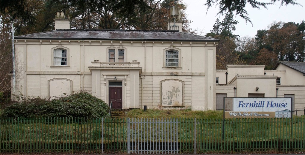 Fernhill House, which features in various loyalist murals/boards, in its present state. In 1996 it was opened as a museum, but has since been shuttered and is gradually falling into disrepair. The house is located off the modern-day Ballygomartin Road, in Glencairn Park.