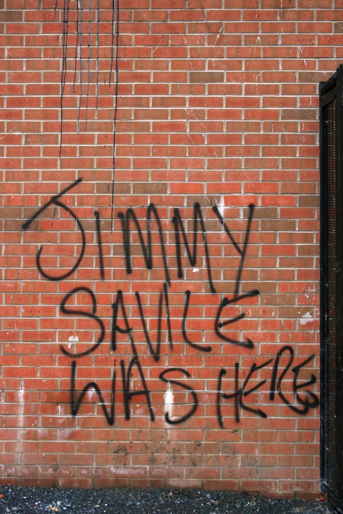 Thompson House #2 2012-11-262024-12-16Extramural Activity Jimmy Savile Was Here: More graffiti on Thompson house, this time referencing the 2012 sex abuse scandal surrounding Jimmy Savile. Click image to enlargeCopyright © 2012 Seosamh Mac CoılleX00750 Rate ThisShare this: Click to email a link to a friend (Opens in new window) Email Click to share on Mastodon (Opens in new window) Mastodon Click to share on Reddit (Opens in new window) Reddit Click to share on Bluesky (Opens in new window) Bluesky Like Loading...