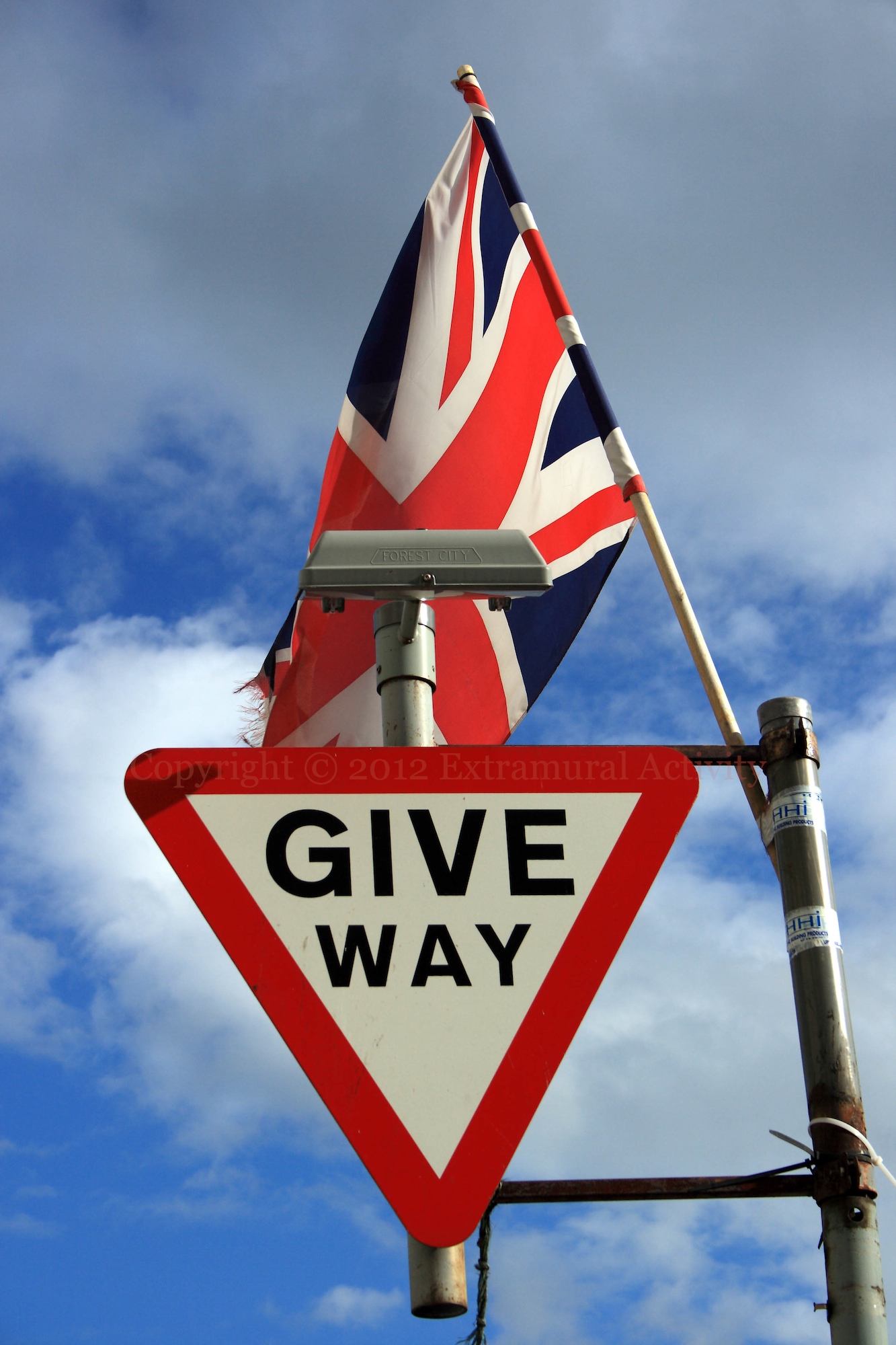 The Union Flag is, how shall we say, “all the rage” these days. (Background from BBC-NI. Here is youtube video of the famous “No Surrender” scream. Gallery of images from protests on Dec 3rd | Dec 8th from U.Tv. Lots of coverage on Slugger O’Toole.) This one is flying over a ‘Give Way’ sign in Donegall Pass.