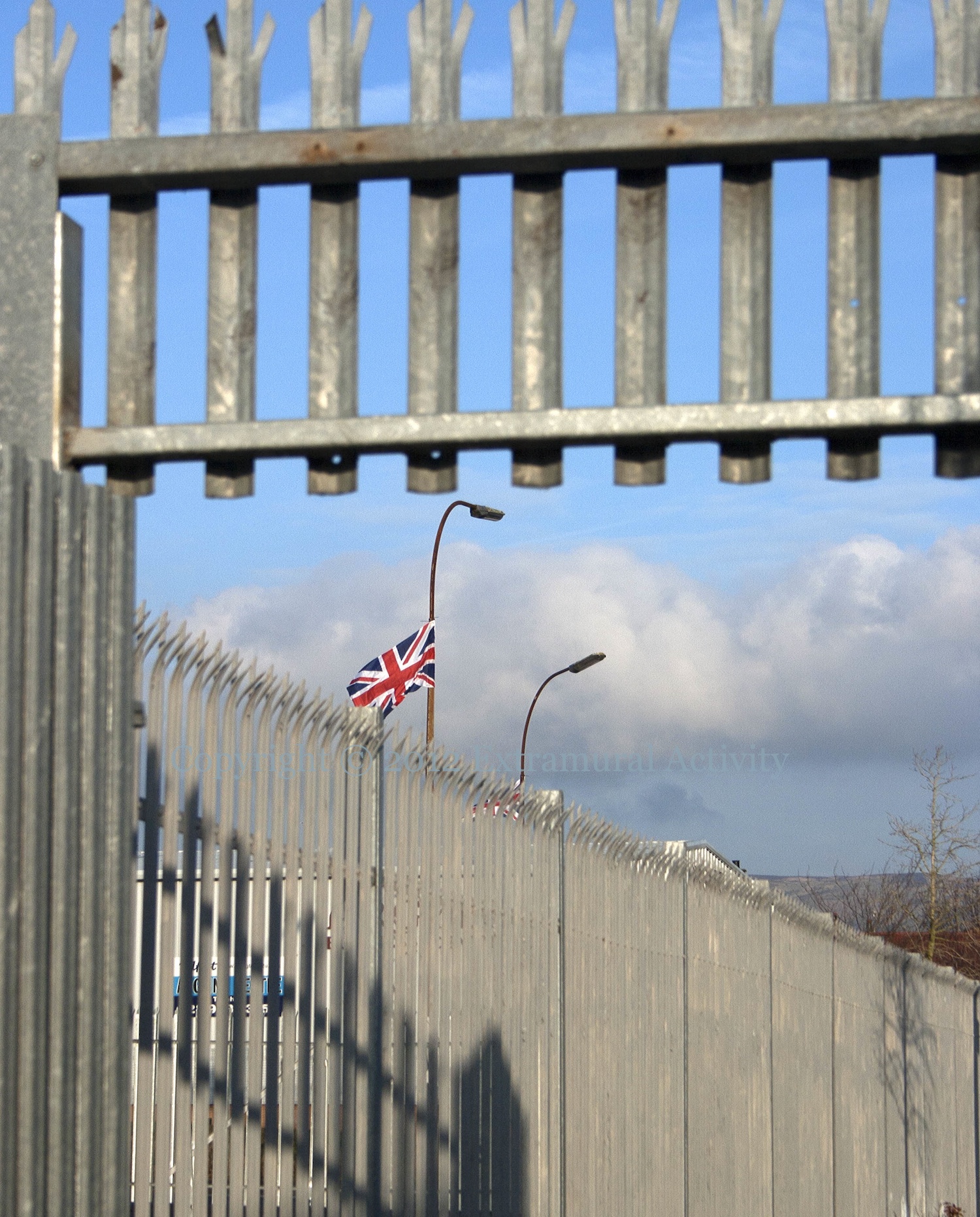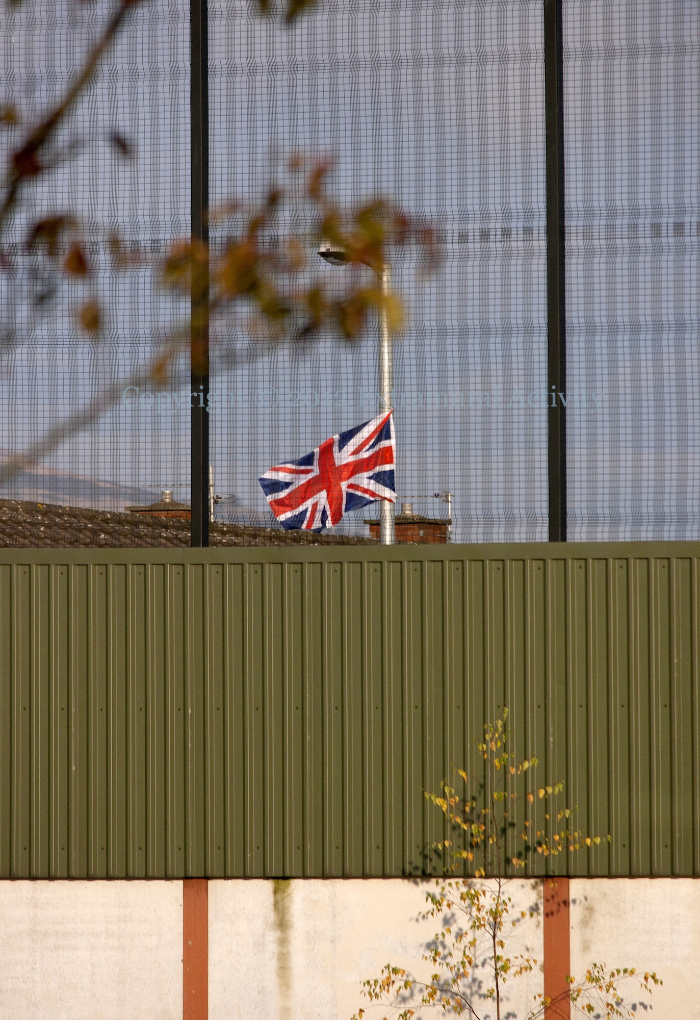 Protests over the December 3rd vote not to fly the union jack every day at Belfast City Hall continued last night (2012-12-17 — video from BBC-NI | U.tv). The image above shows a flag flying on the loyalist side framed by the pedestrian gate on Northumberland Street. The image below shows one shot across the Cupar Way “peace” line, from Conway Street.