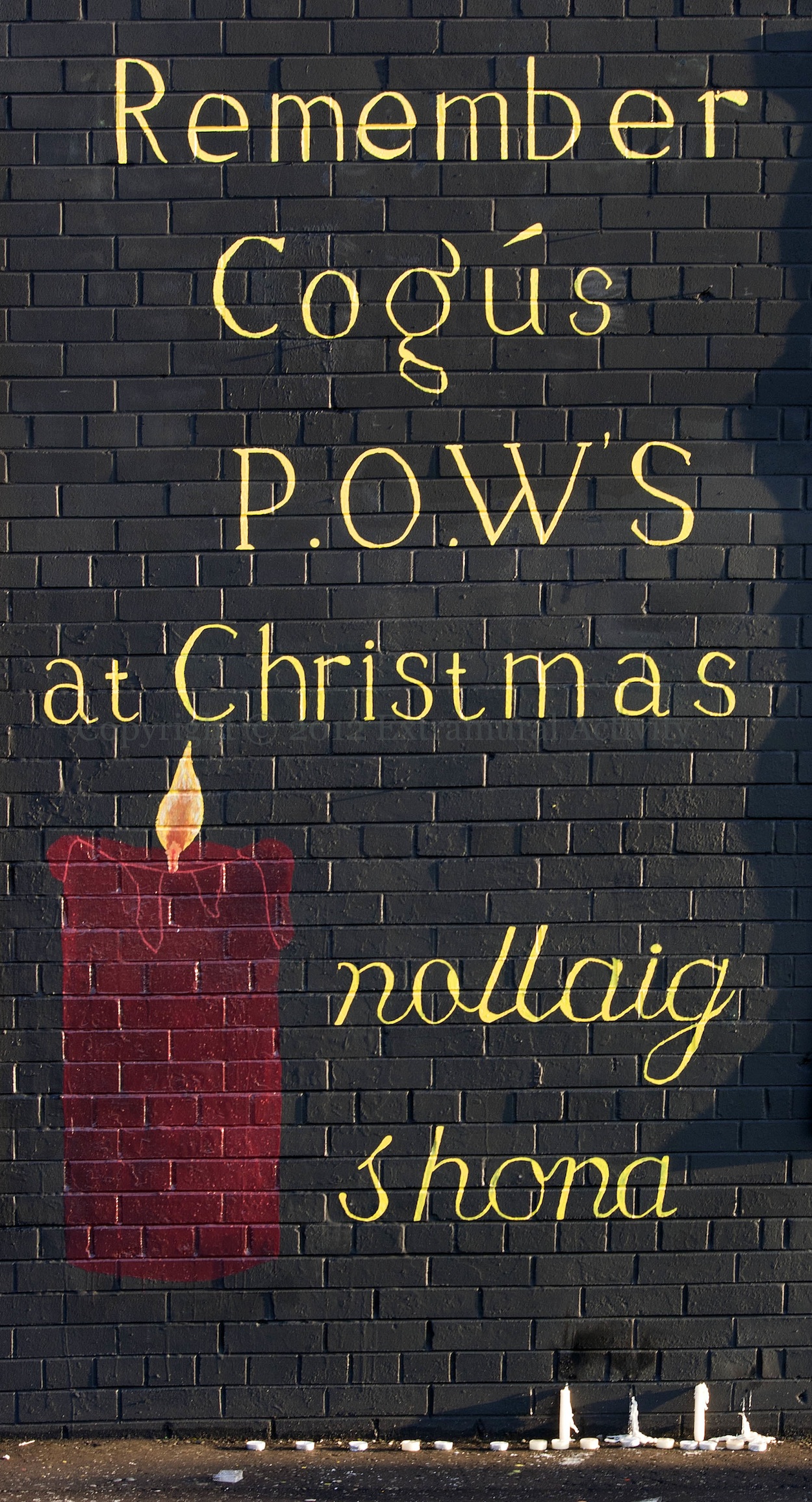 Seasonal greeting in support of Republican political prisoners – with candles at base – in Northumberland St. This is the centre part of a wider mural-board composite – left and right shots below.