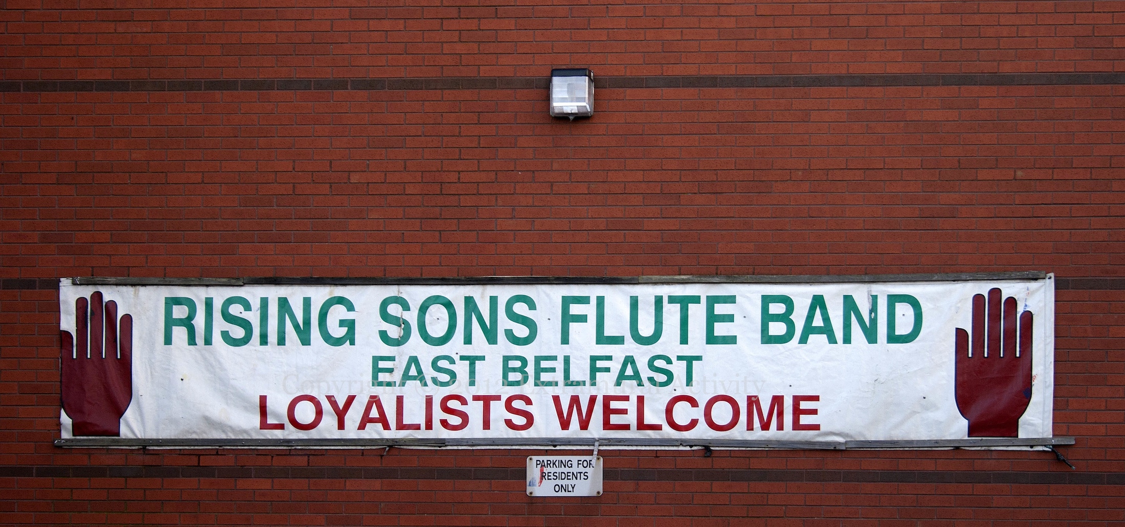 A banner announcing the Rising Sons Flute Band outside their practice hall in east Belfast. (Previously: Rising Sons mural)