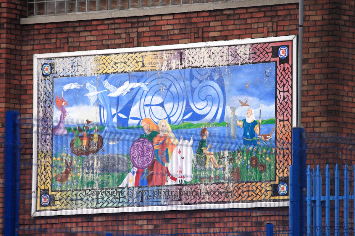 Stories from mythical Ireland including the Children Of Lear, Oısín & Nıamh, and the Salmon Of Knowledge are depicted in a 2006 mural painted by Mo Chara with the children of the Whiterock Children’s Centre.