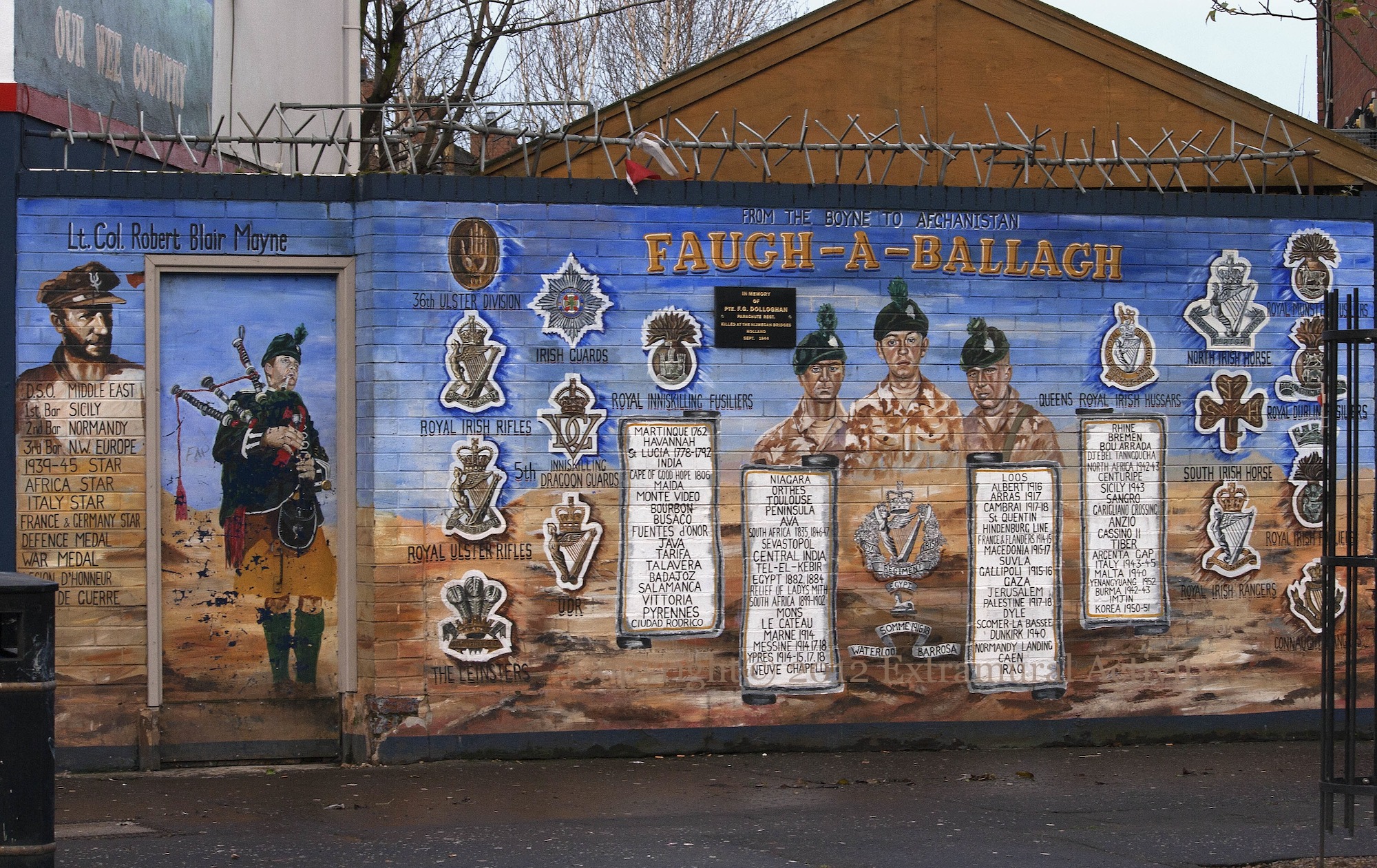 On the side wall of the Times Bar in York Street, a mural commemorating Irish and Northern Irish service in the British military.
