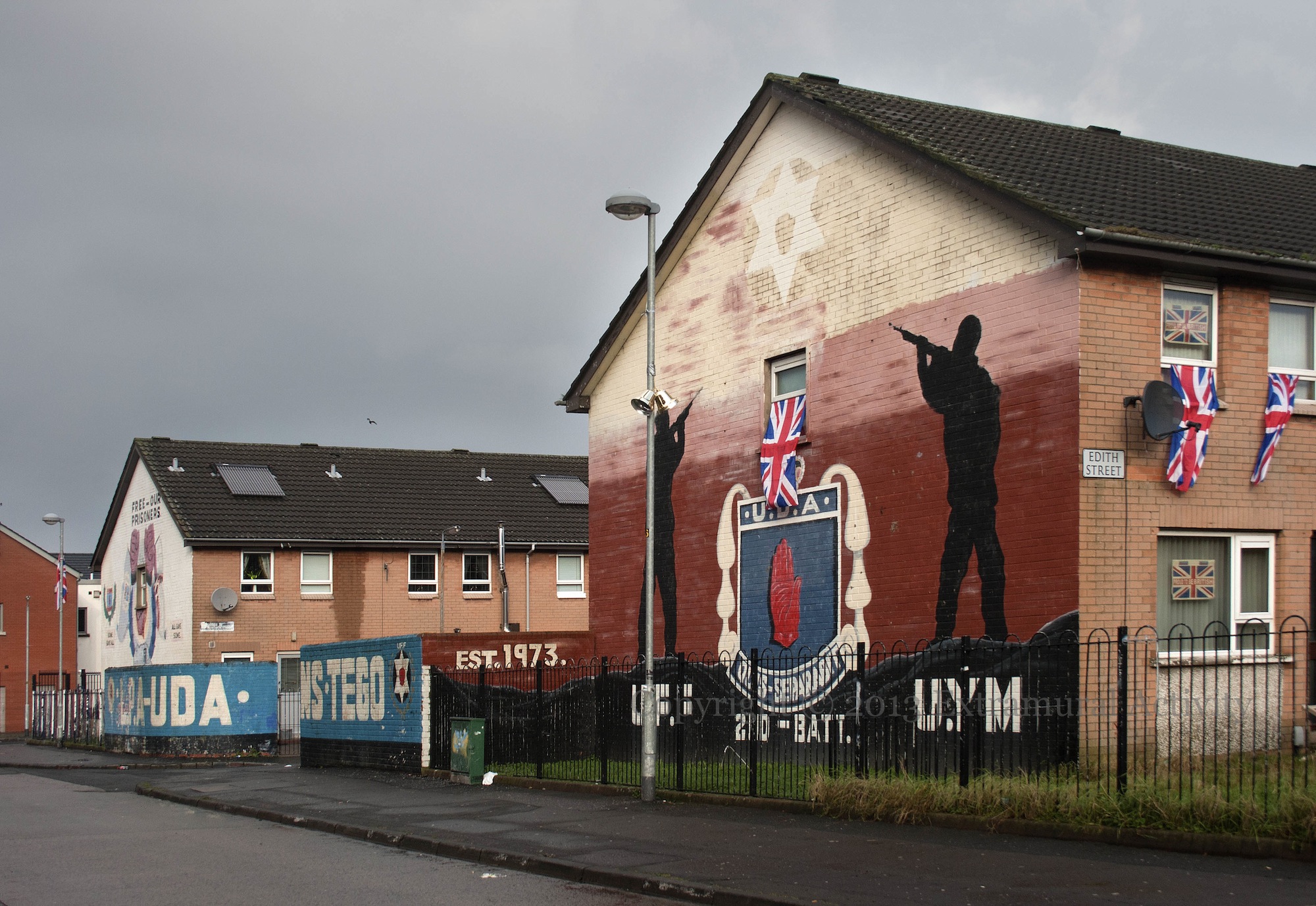 “Striking, I Defend.” UDA murals in Lord Street, below the Albertbridge Road, accented by Union jacks (and, as can be seen in the wide shot, below, a pair of silver bells). The mural in the background of the wide shot is featured in All Gave Some.