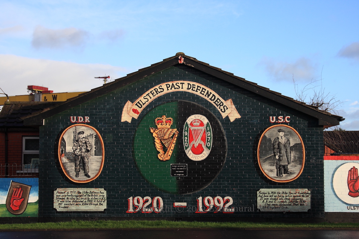 The “Ulsters Past Defenders” mural has been completely repainted though with a similar layout as before: UDR on the left, USC/ B-Specials on the right, but now with the USC emblem joining the UDR’s in the centre.