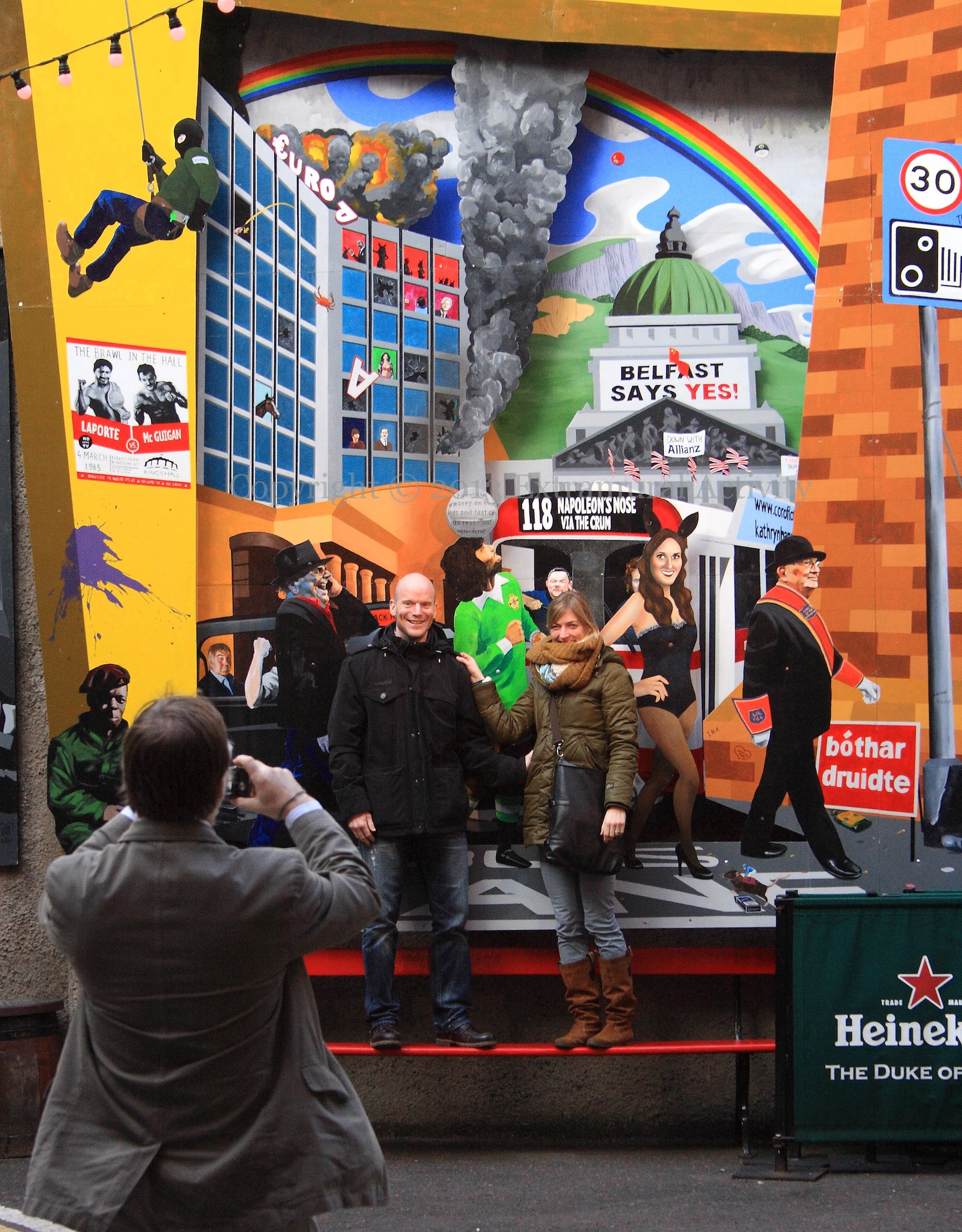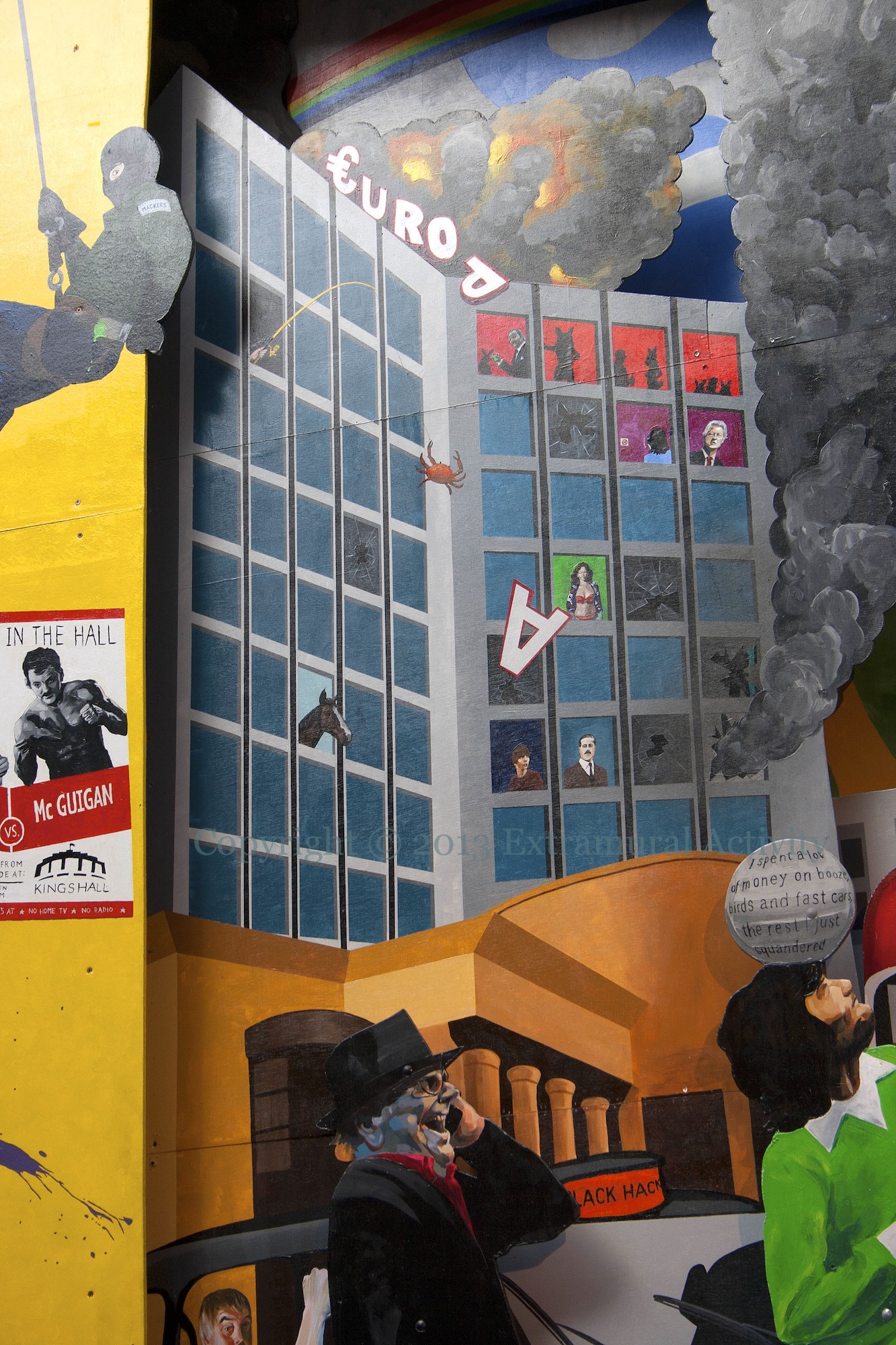 Local readers will hopefully be able to help identify the people (and the horse, and the crab on a fishing line) staying in the Europa Hotel, as depicted in a new (late 2012) board/construction at the Dark Horse/Duke Of York. Artist Ciaran Gallagher has a collection of pictures of the piece being constructed and installed.