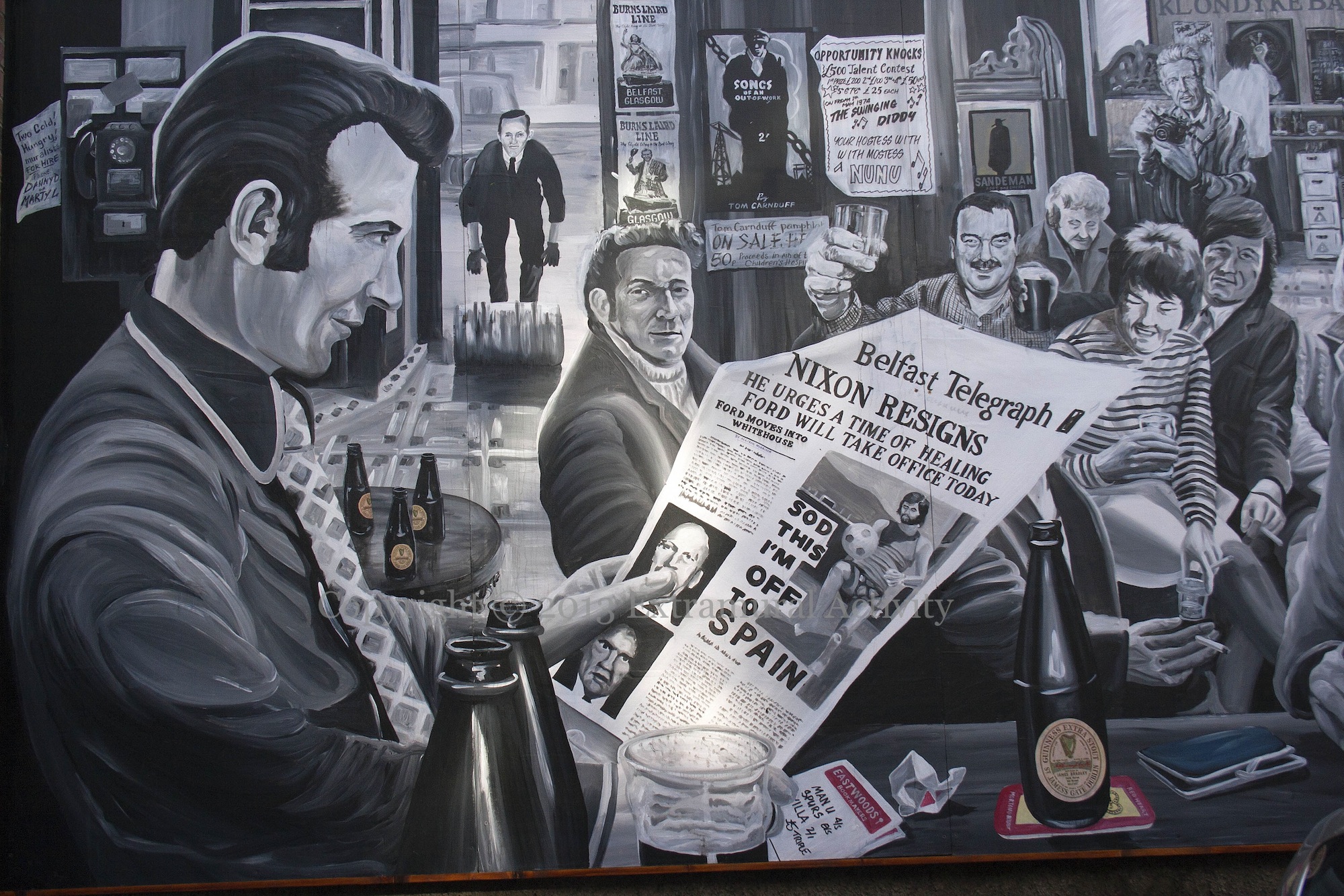 Another George Best reference in another mural at the Dark Horse/Duke of York. George Best quit Manchester United (temporarily) for Spain towards the end of the 1972 season (and quit United for good in 1974). The precise phrase — “Sod this, I’m off to Marbella” — and picture of Best playing keepsy-upsies in the sun come from a John Roberts book about Best. Nixon resigned on August 9, 1974 (WP). The Klondyke Bar was in (PUL) Sandy Row and bombed by the IRA in January, 1976.