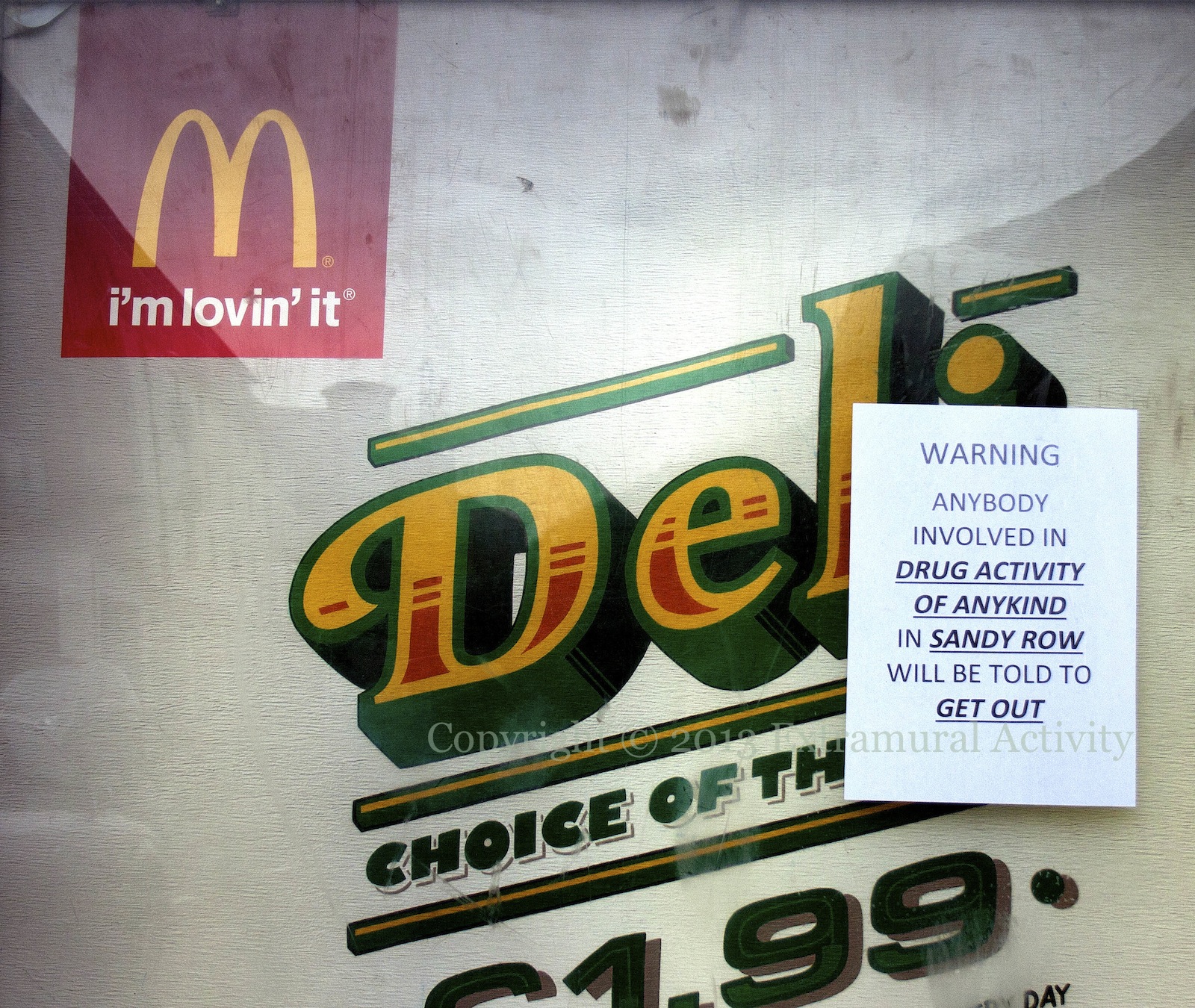 A sign on an advertising hoarding on Donegall Road, with a warning to drug dealers. (Not in a McDonald’s window, as previously stated.)