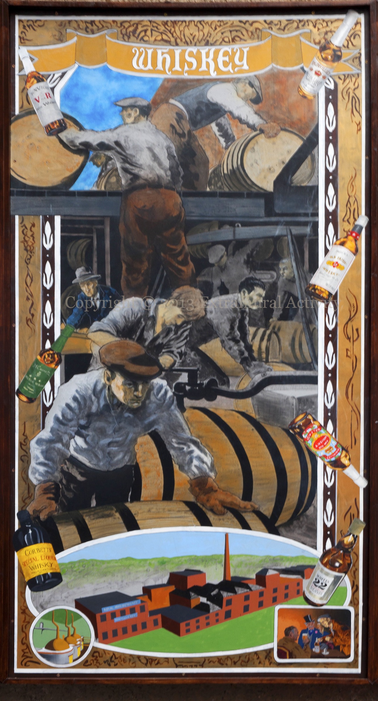 Whiskey, the middle of five panels (see below) in another piece from the Duke Of York pub in the city centre portraying four Northern Irish industries of/in the past – rope, ships, whiskey – the words to the song William Bloat – and tobacco products.