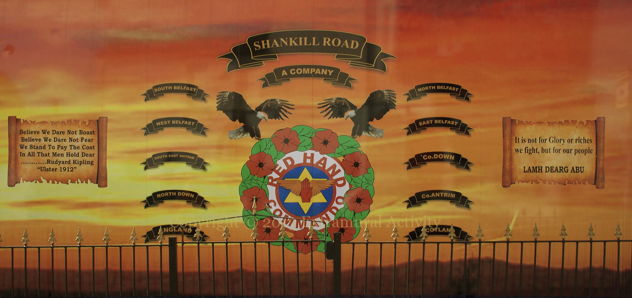 A few words of Irish – “Lamh Dearg Abu” – in a loyalist mural in Glenwood Street, just off the Shankill Road, through strictly it should be “Lámh Dhearg Abú”. “Lámh dhearg” means “red hand”, and this is a Red Hand Commando mural.