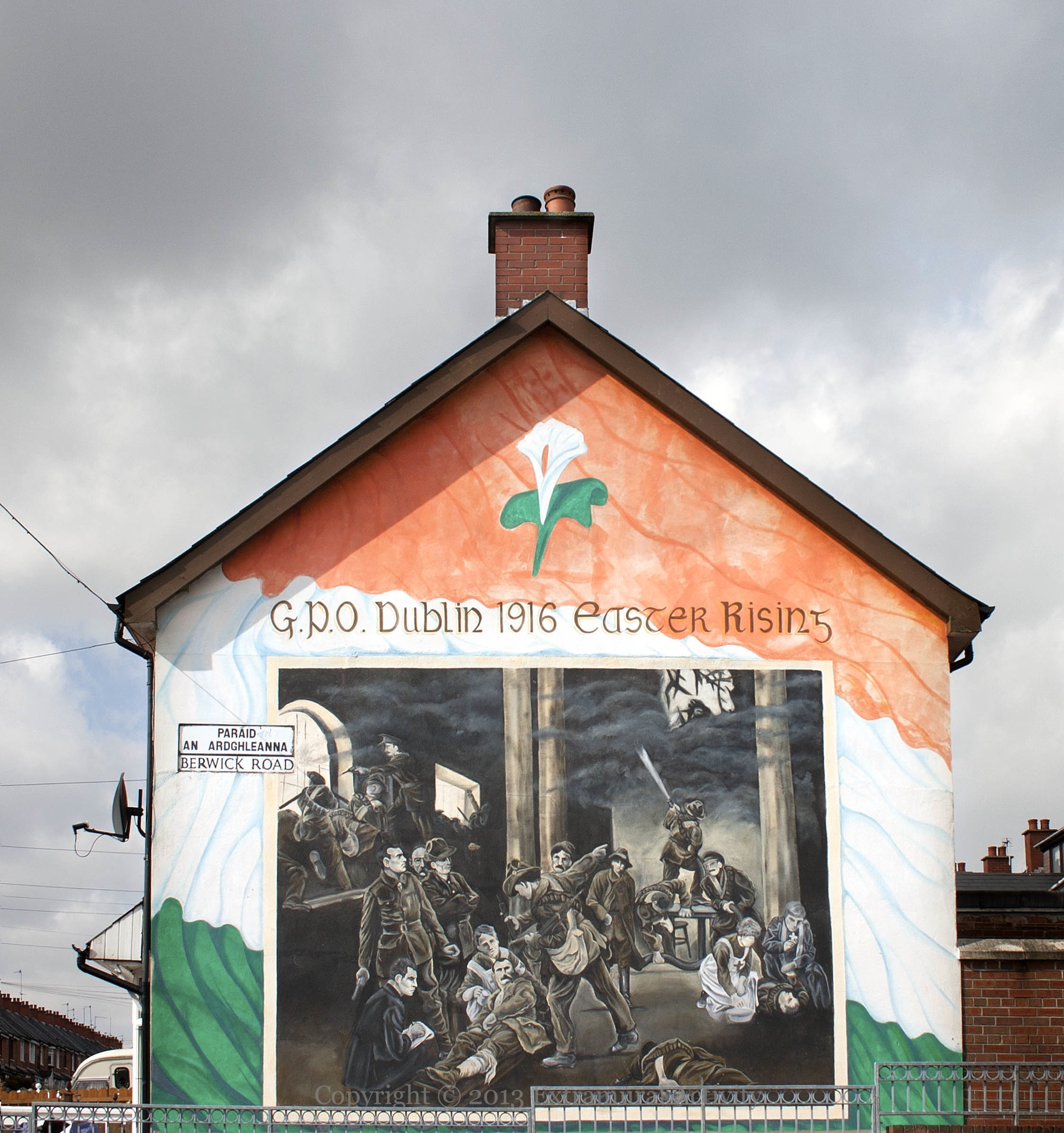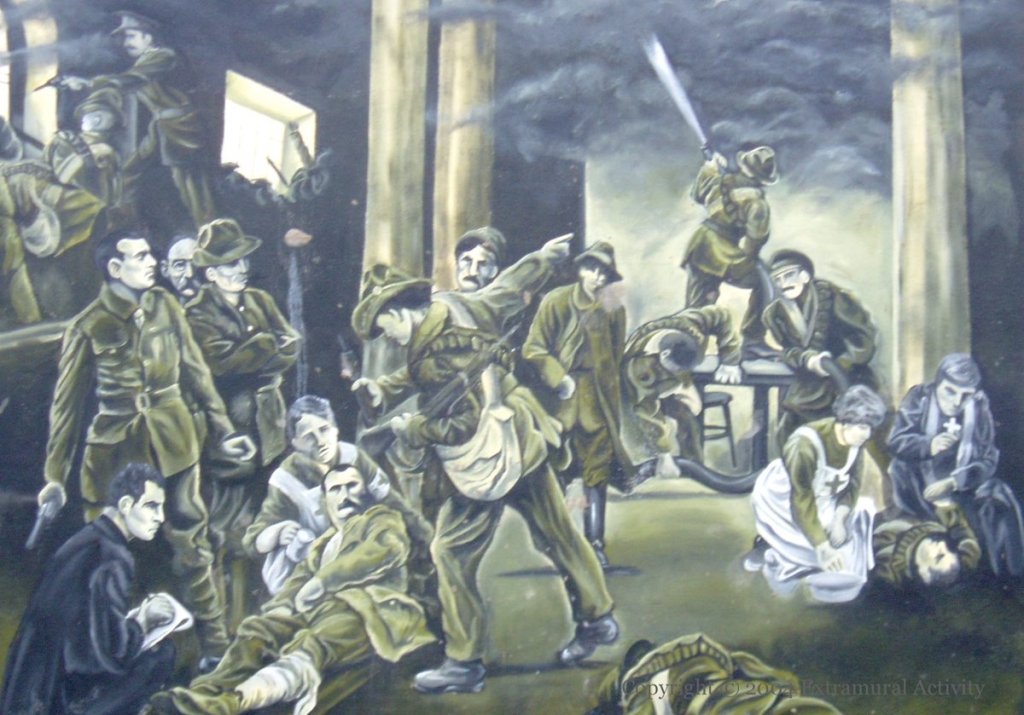 See previously: Easter Rising – Whiterock Road mural depicting Countess Markievicz outside the GPO during the Rising.
