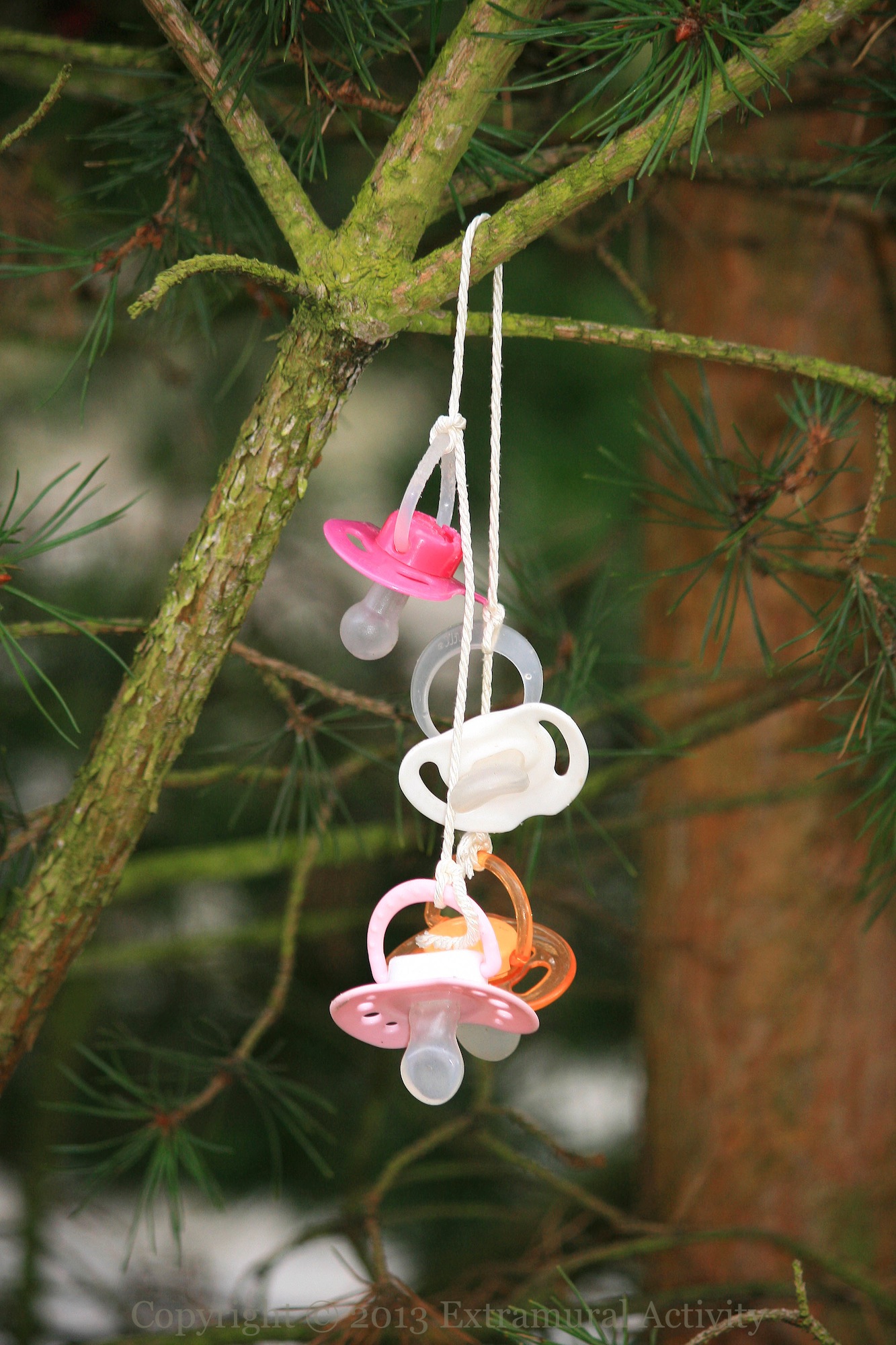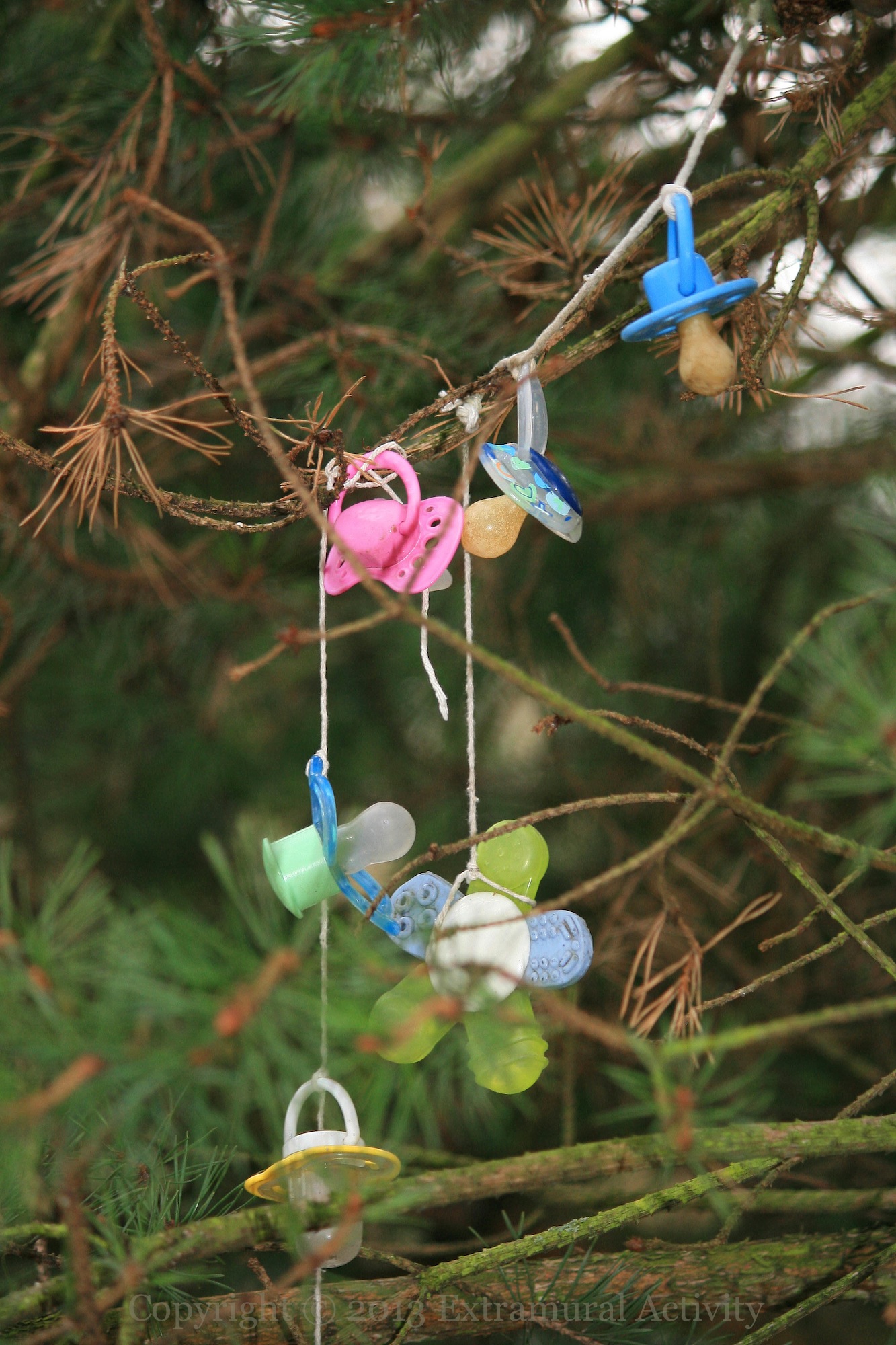 According to this page from Early Christian Sites In Ireland, trees next to wells were considered holy, and “rags were tied to trees, or objects left there, in the belief that, while they remained, the prayers were still effective”. These pacifiers (or dummies, as they are commonly known) were spotted hanging from trees in the Waterworks. Are these the holy trees of our Late Christian period? Or just a sign that drugs can be procured?
