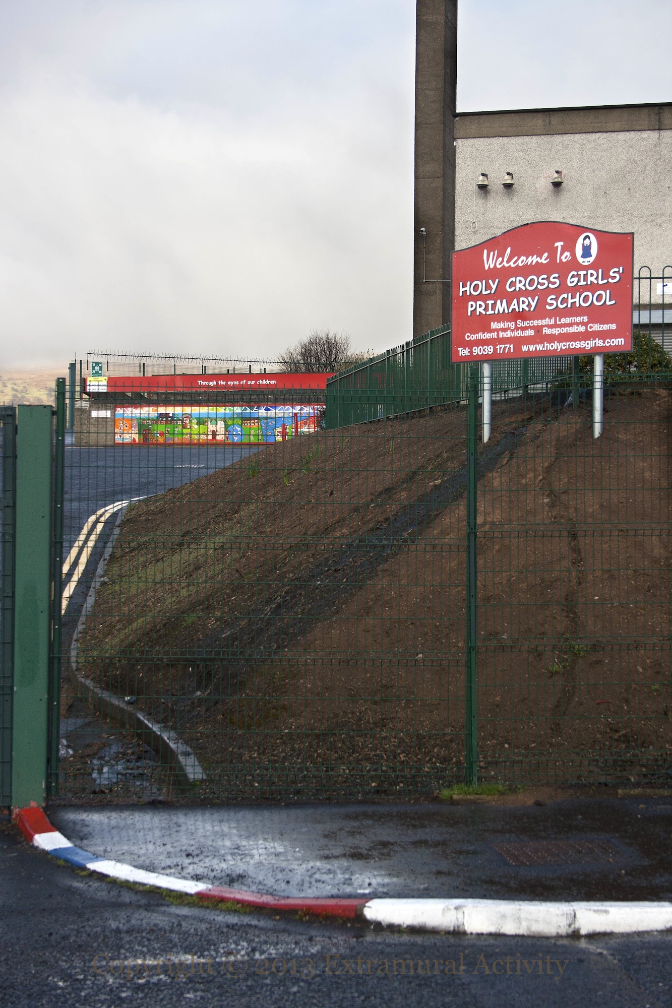 Holy Cross Primary – an all-girls Catholic school – sits in the loyalist Glenbryn neighbourhood, above Alliance Avenue in Ardoyne. The freshly-painted kerb-stones leave no doubt as to the precarious situation of the school, which is well-known as the site of a dispute in 2001 when loyalists attempted to block access to the school (WP).