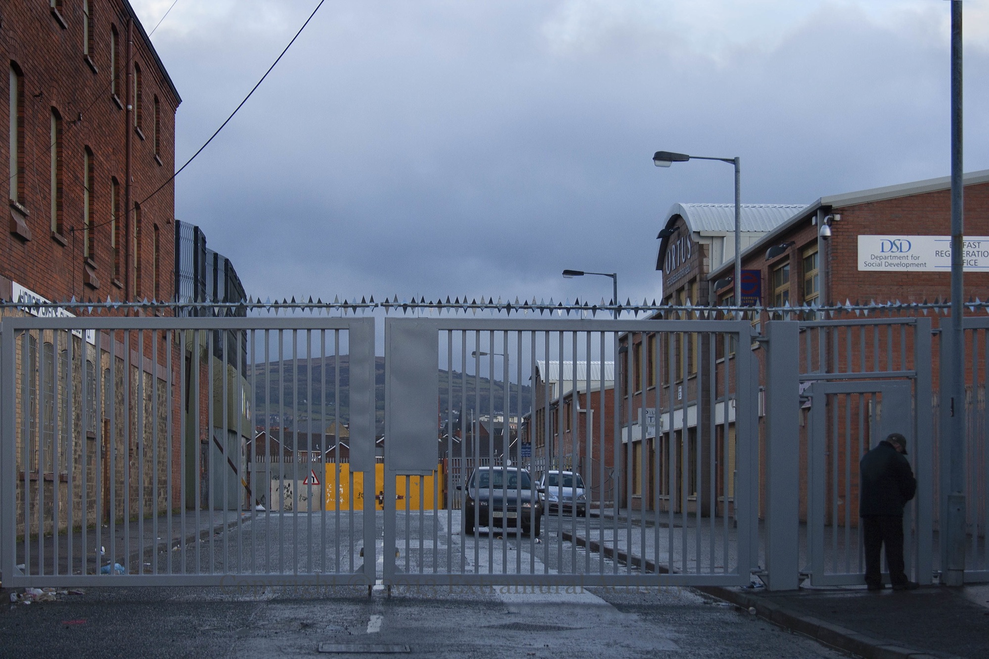 A small sign of progress, perhaps: these new gates at the bottom of Howard Street are see-through and reveal the hills in the distance. For comparison, see the solid yellow gates on the Cupar Way (Shankill) side.