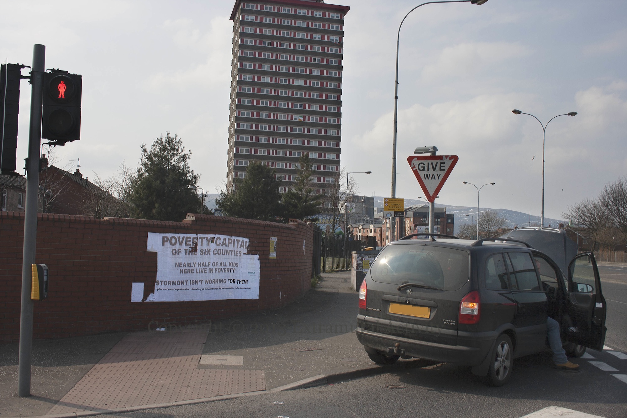 A broken-down car at the top of the Westlink in the shadow of Divis flats, beside a poster reading “Poverty capital of the six counties. Nearly half of all kids here live in poverty. Stormont isn’t working for them! Equal rights and equal opportunities … cherishing all the children of the nation equally – Proclamation of 1916”.