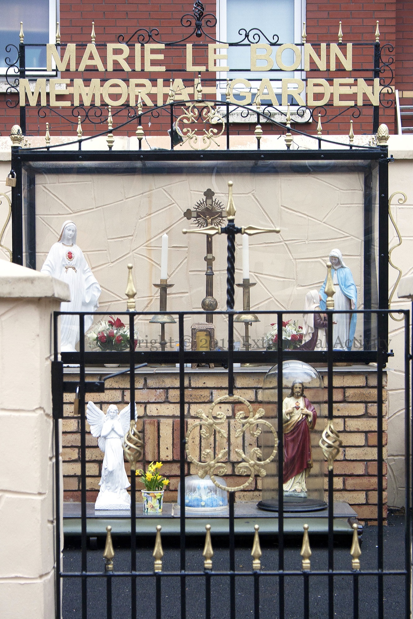 Shown is a small memorial garden in Clós Ard An Lao/Ardilea Close. There is no record at all, on-line at least, of a Marie Le Bonn. “Marrowbone” is sometimes thought to be a corruption of “Marie Le Bone” (and “Marylebone” in London is derived from the church of St Mary’s on the bourne (stream) (WP)) but a more likely derivation, given the location, is Machaıre Botháın, the plain of the (shepherd’s) hut. But Mary The Good is more in keeping with the shrine.