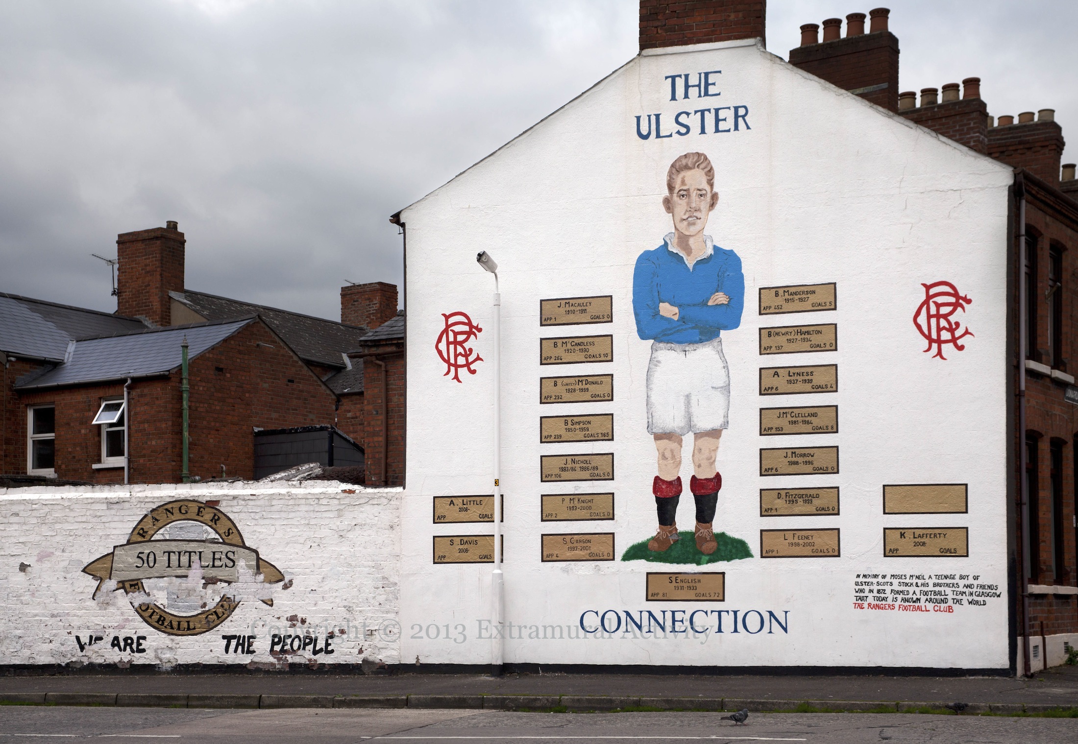 A mural in east Belfast listing local players who have played for Rangers, in Glasgow, Scotland. Featured in the centre is S. English, who scored 72 goals in 81 appearances, including 44 in the 1931-1932 season. Additional player plaques have been added since 2008, as well as the dedication in the lower right corner: “In memory of Moses McNeill, a teenage boy of Ulster-Scots stock & his brothers and friends who in 1872 formed a football team in Glasgow that today is known around the world as the Rangers Football Club “.