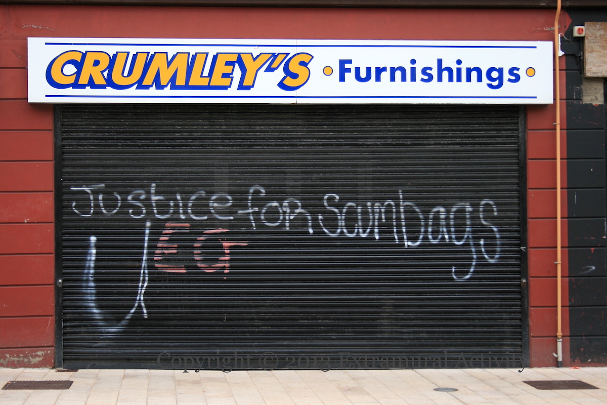 Justice For Scumbags 2013-06-022024-12-21Extramural Activity The reference here is perhaps punishment beatings and shootings for anti-social behaviour. William St, Derry Click image to enlargeCopyright © 2013 Seosamh Mac CoılleX05234 Rate ThisShare this: Click to email a link to a friend (Opens in new window) Email Click to share on Mastodon (Opens in new window) Mastodon Click to share on Reddit (Opens in new window) Reddit Click to share on Bluesky (Opens in new window) Bluesky Like Loading...