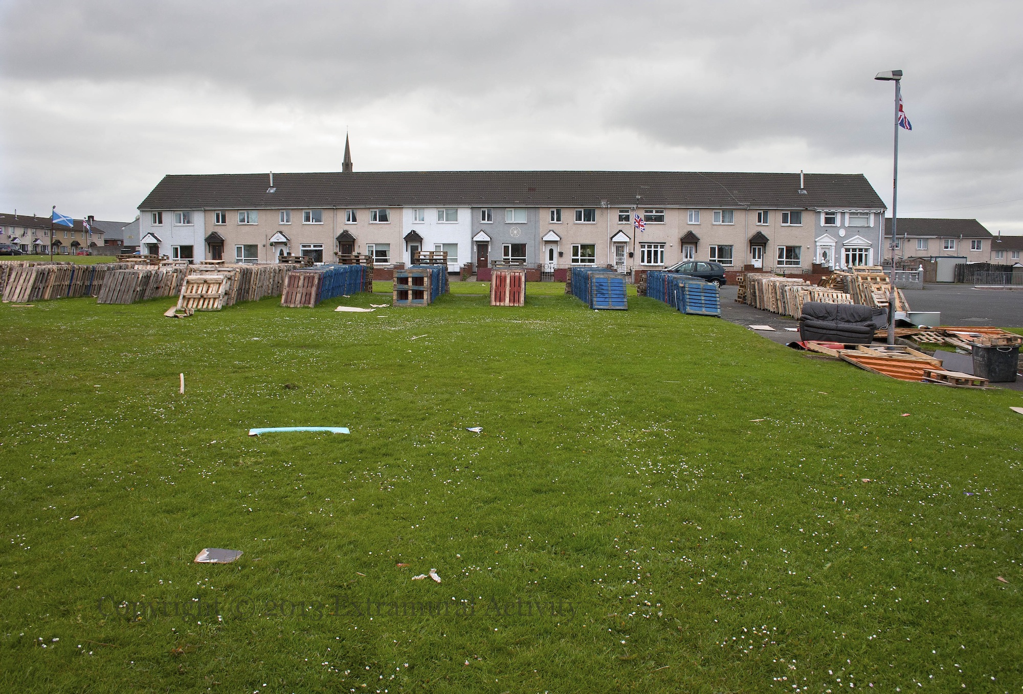Pallets lined up in preparation for bonfires on the Twelfth (of July) in front of the human rights mural on the green behind Hopewell Crescent. A mural of the event being celebrated – King Billy (William Of Orange) crossing the Boyne river in 1690 – can be seen in the distance on the right. The words on the wall to the right read: “Where after all do universal human rights begin? … In small places close to home, so close & so small that they cannot be seen on any map of the world … such are the places that every man, woman & child seek equal justice, equal opportunity, equal dignity.”