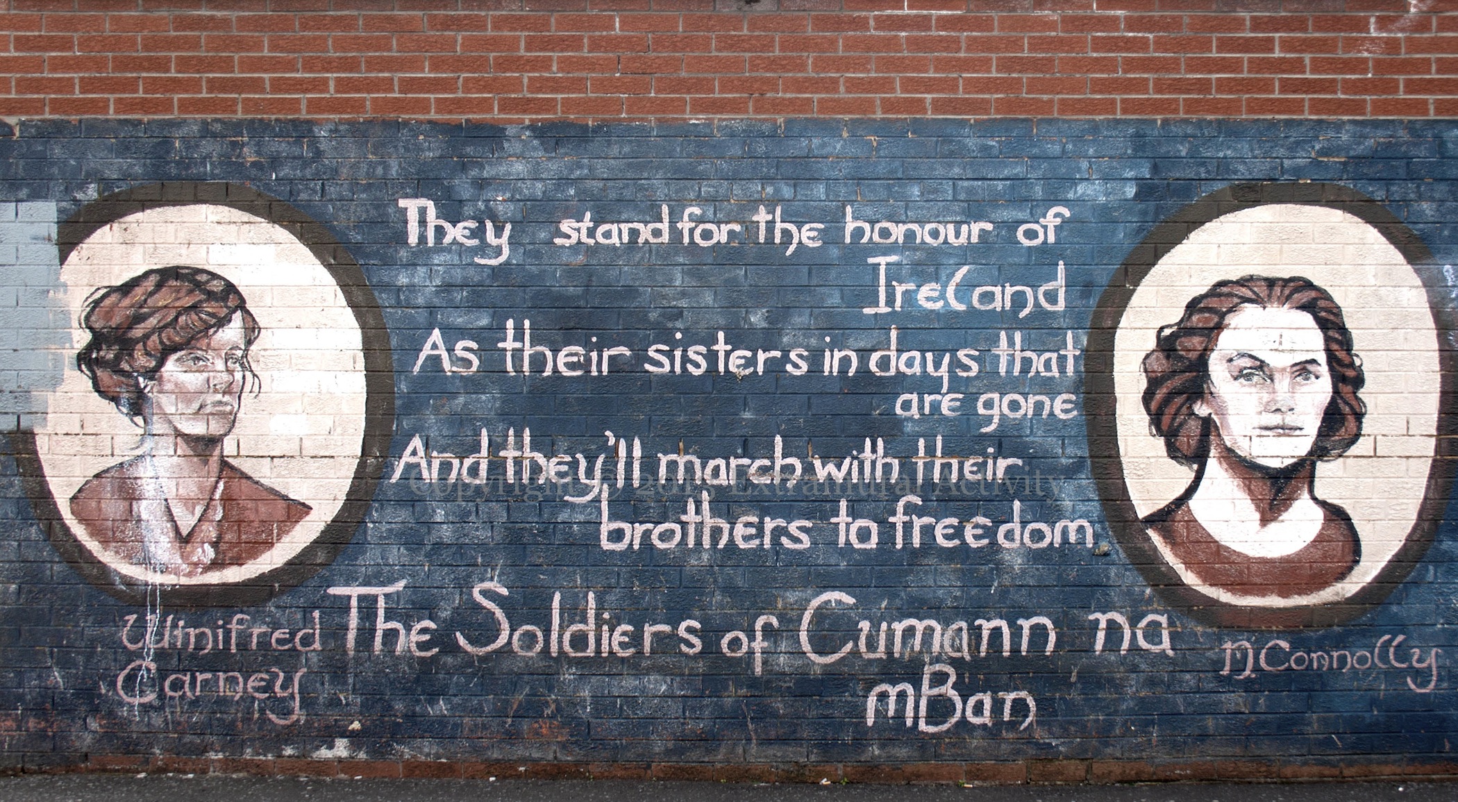 Republican mural in Sráıd Na Sceıthe/Hawthorn Street at the junction with Cavendish Street celebrating the lives of Winifred Carney and Nora Connolly. “They stand for the honour of Ireland, As their sisters in days that are gone, And they’ll march with their brothers to freedom, The soldiers of Cumann na mBan.” Below is a 1965 video of Connolly talking about her life (1893-1981 (WP)) and her father James Connolly, who was executed after the 1916 rising. Carney, who grew up and lived in Belfast, was inside the GPO with Connolly. After the rising, she returned to Belfast, married a Protestant, and continued to advocate socialism (WP).