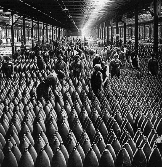 The recruitment poster on which the mural is based is shown below. British Pathé has some footage of women working in a munitions factory, presumably in England somewhere. BBC has a page on a massive explosion at the Chilwell (Nottingham) factory. Below is an unattributed image (via http://smnmcshannon.hubpages.com/) of workers amongst shells in 1915.