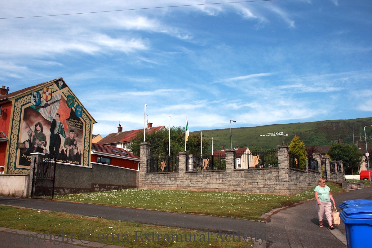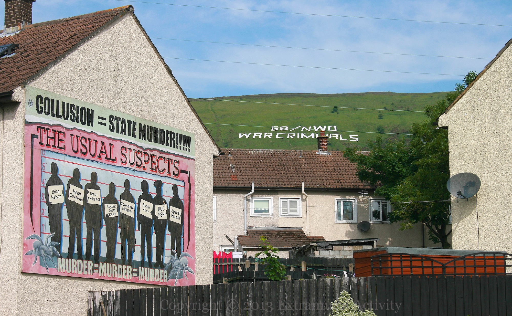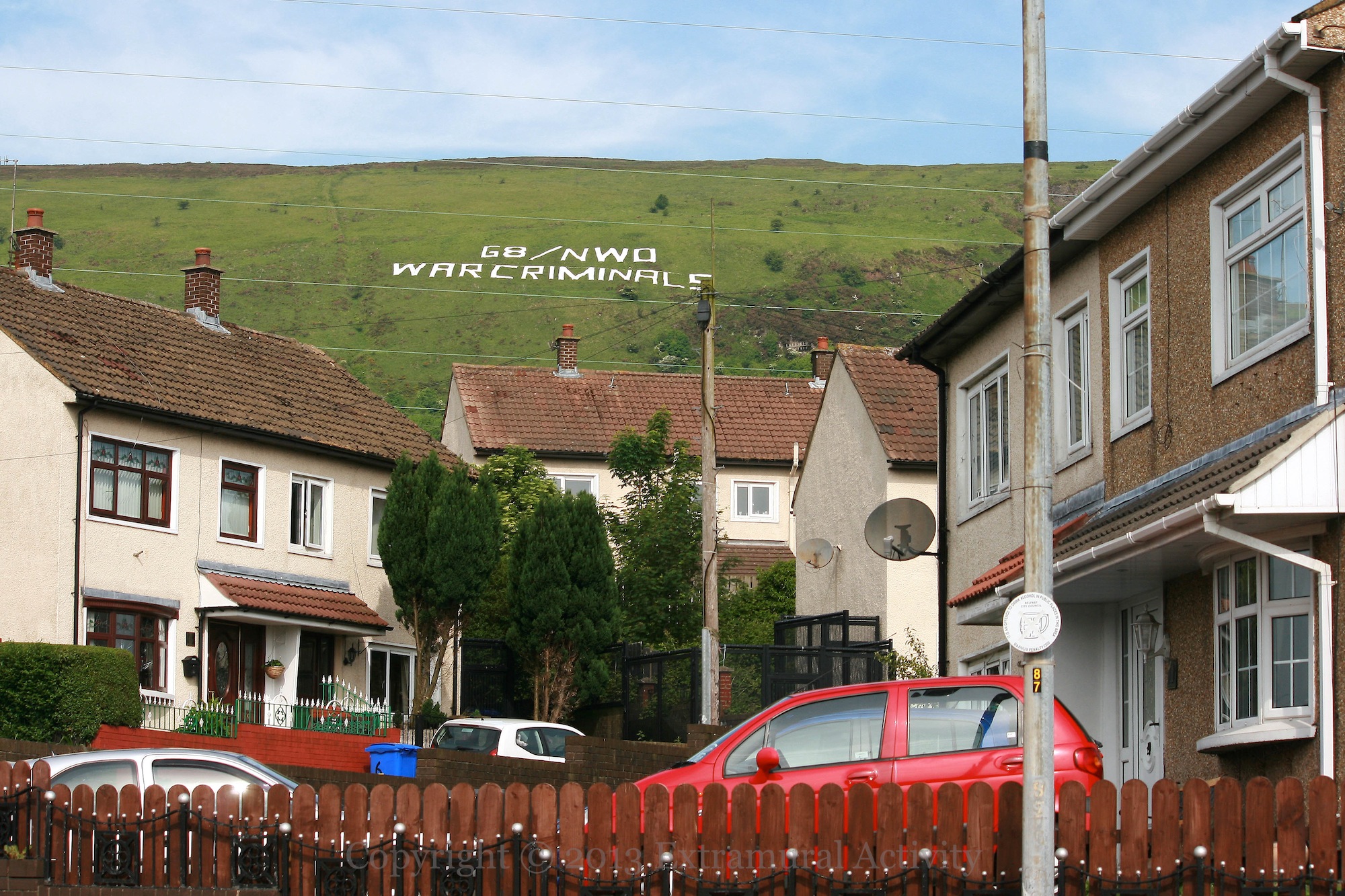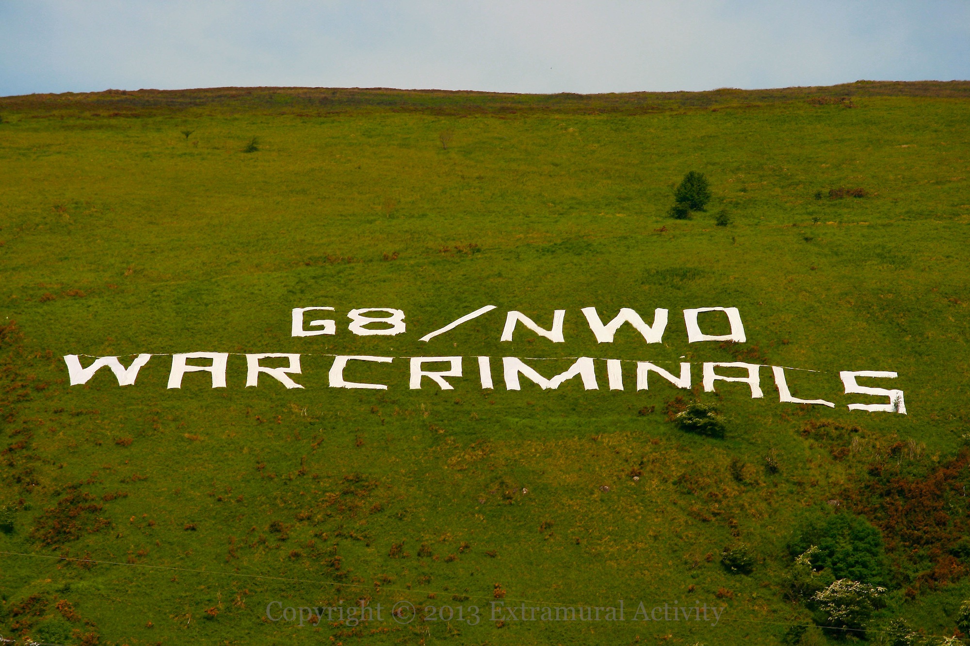 To coincide with the G8 meeting taking place in Fermanagh this week “G8/NWO – War Criminals” appeared on the side of Black Mountain above New Barnsley.