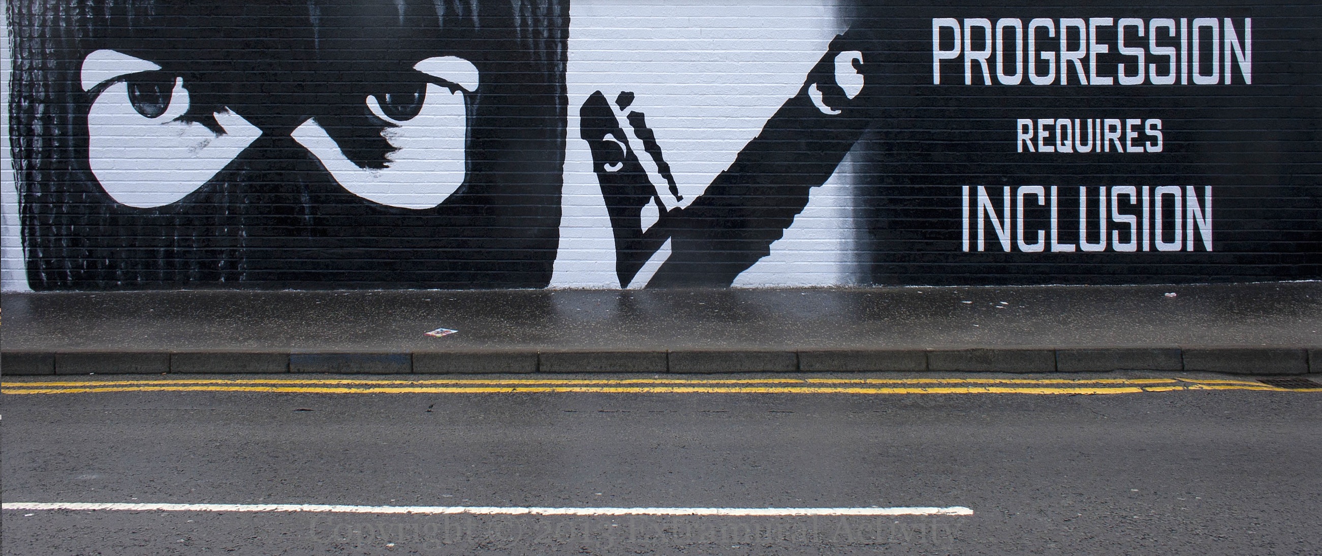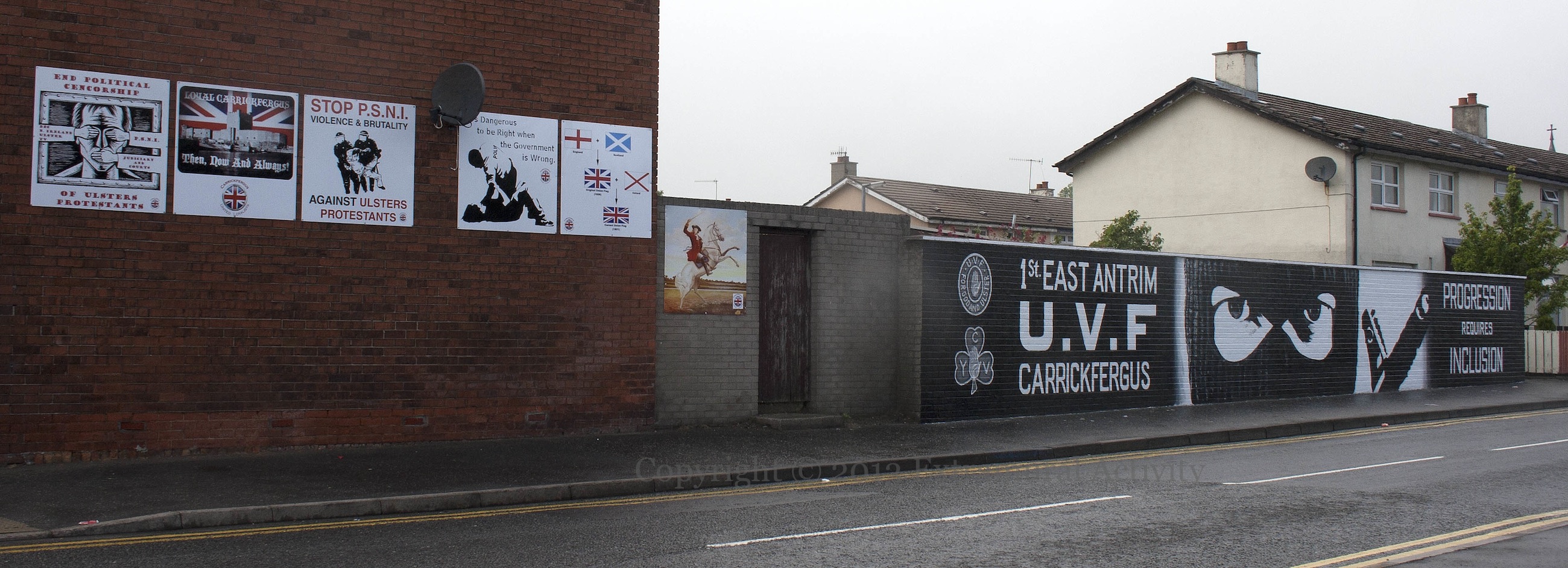 “Progression Requires Inclusion” – a new UVF mural (painted last Saturday, 2013-06-22) in Carrickfergus shows a balaclava’d head and assault rifle. Wide shot below. For the three boards, see End Political Censorship. For the two boards, see It’s Dangerous To Be Right.