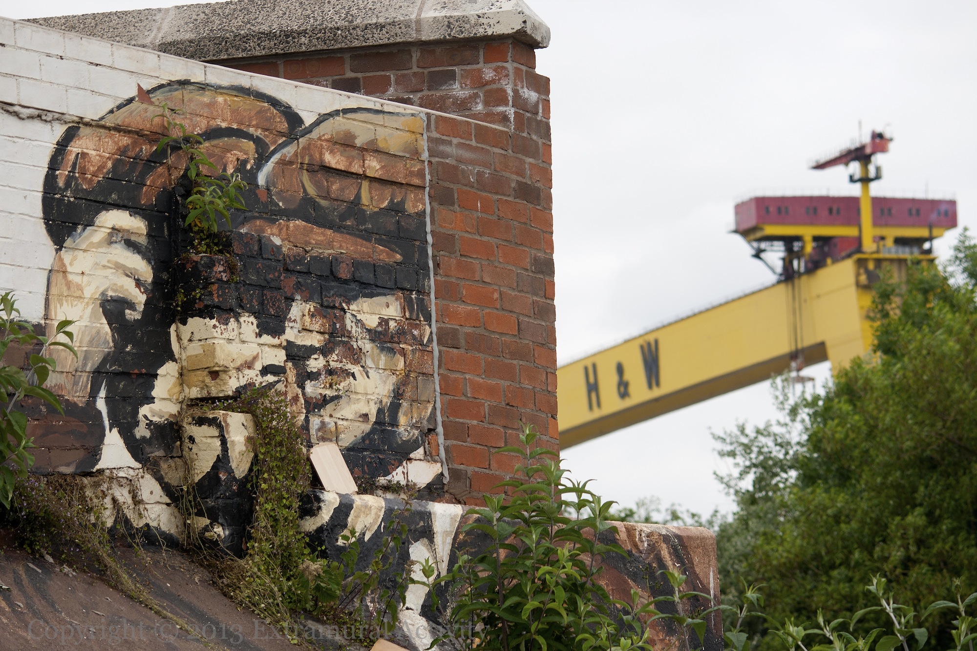 Three shots of an old mural above the steps to the pedestrian walkway over the Sydenham bypass in east Belfast, featuring workers from the turn of the 20th century at the Harland & Wolff shipyard, which can be seen in the third image.