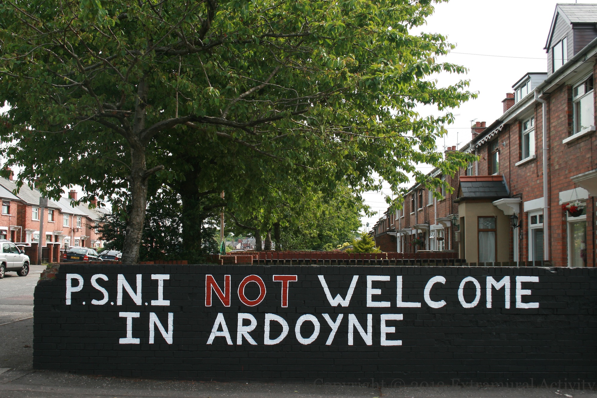 Painted signage at the north end of Berwick Road/Paráıd An Ardghleanna in Ardoyne/Ard Eoın (next to the Maıréad Farrell piece featured previously): “P.S.N.I. not welcome in Ardoyne”.