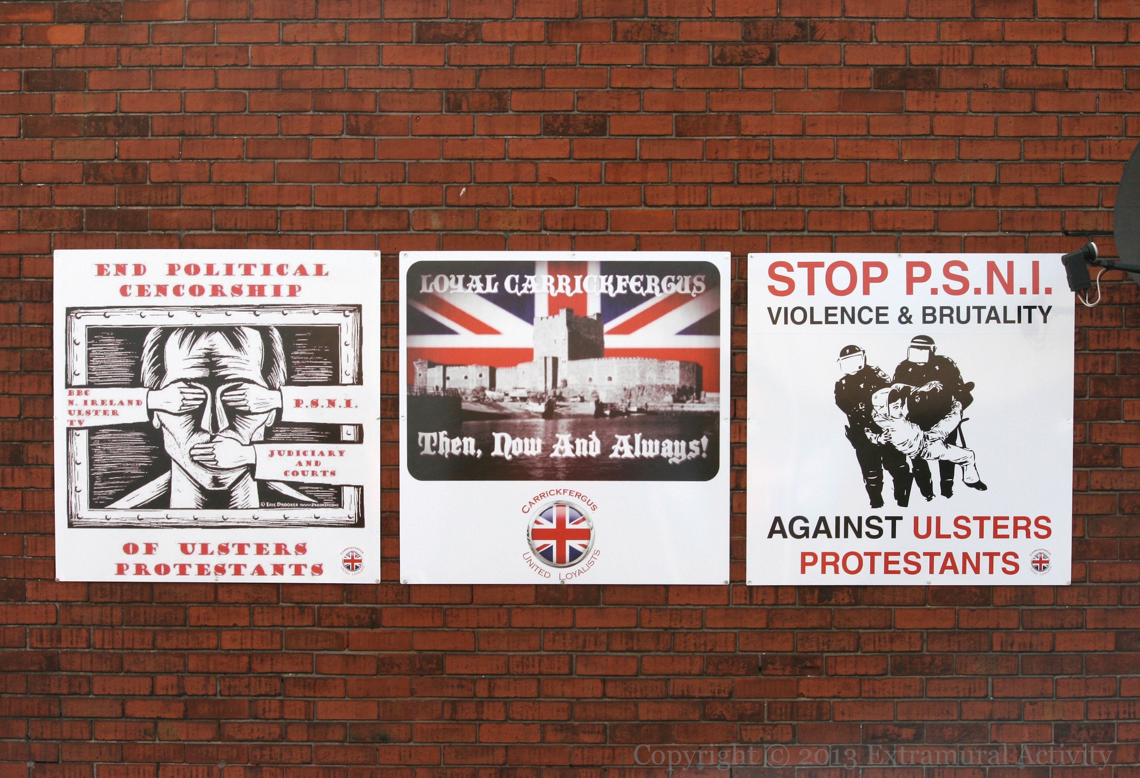 Three political panels in Carrickfergus detailing Loyalist frustration from the union flag protests. More have been added and still more due to be added by the Carrickfergus United Loyalist forum, which formed at the outset of the protests.
