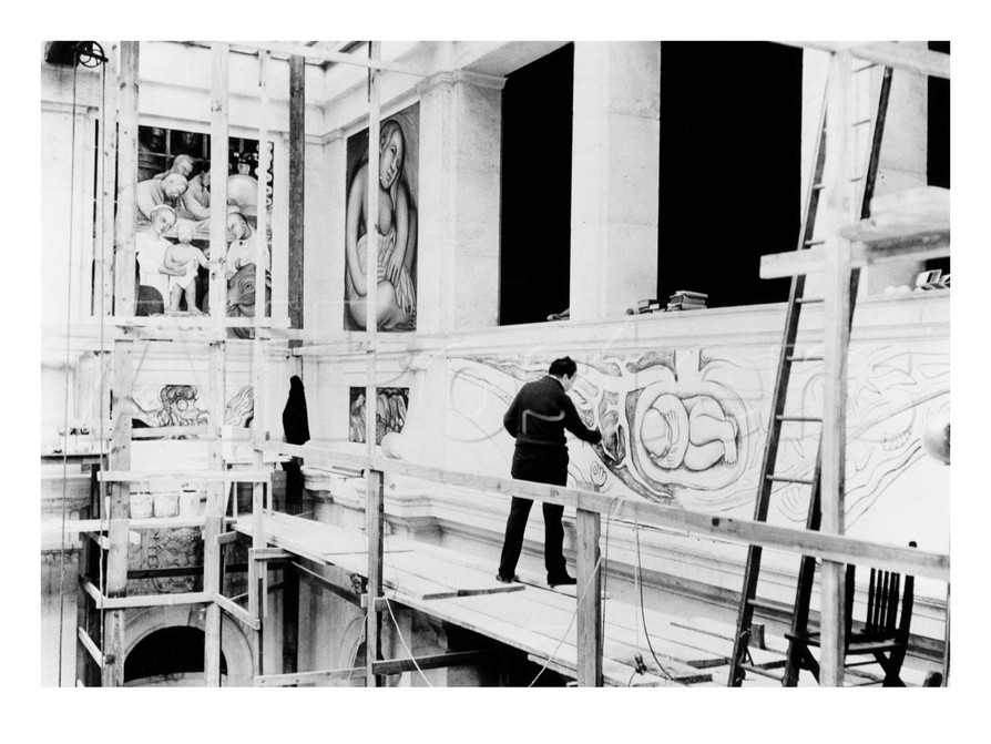 Below is an (unaccredited) image of Rivera painting the outline (the “cartoon”) for this section of the wall, in 1932.