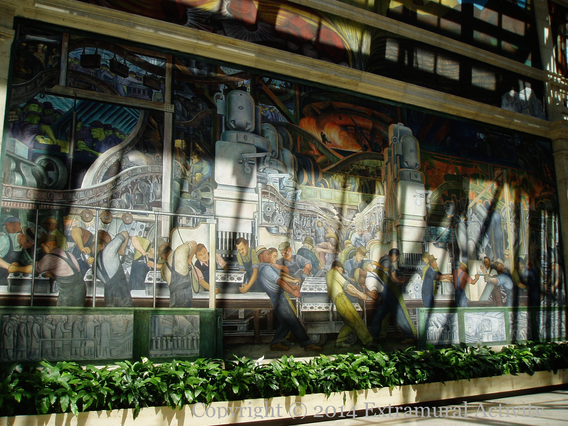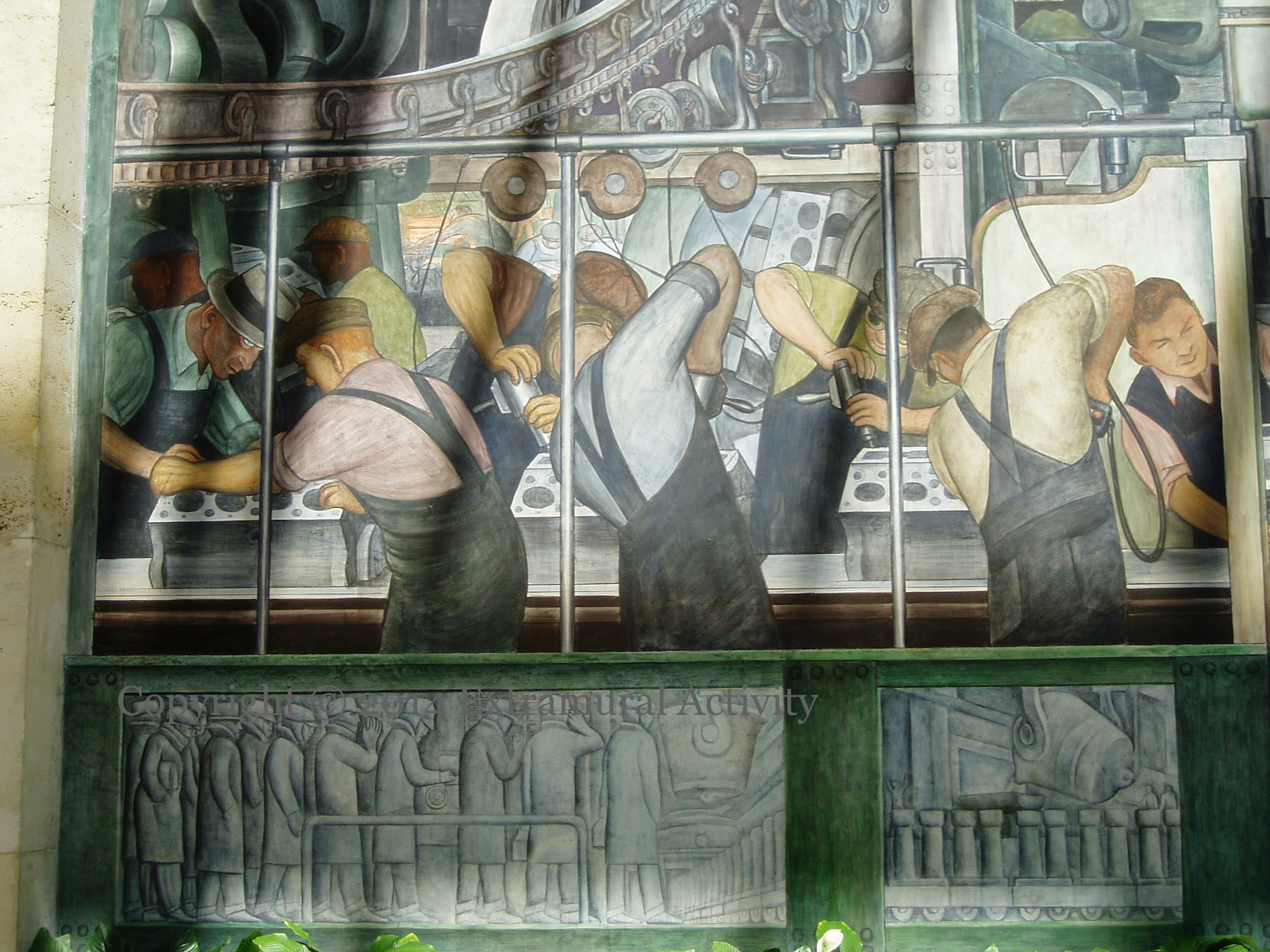 As can be seen from the final image below (showing the whole of the main panel), a bright sunlight was streaming through the glass ceiling on the day of our visit to Diego Rivera’s Detroit Industry frescoes in the Detroit Institute of Arts, making many of our images of the north wall unusable and degrading the quality of the few included here. They nonetheless show the stunning level of detail Rivera went to despite the massive size of the work. These are all of the main panel, the bottom third of which shows construction of the eight-cylinder engine for the Model B (probably).
