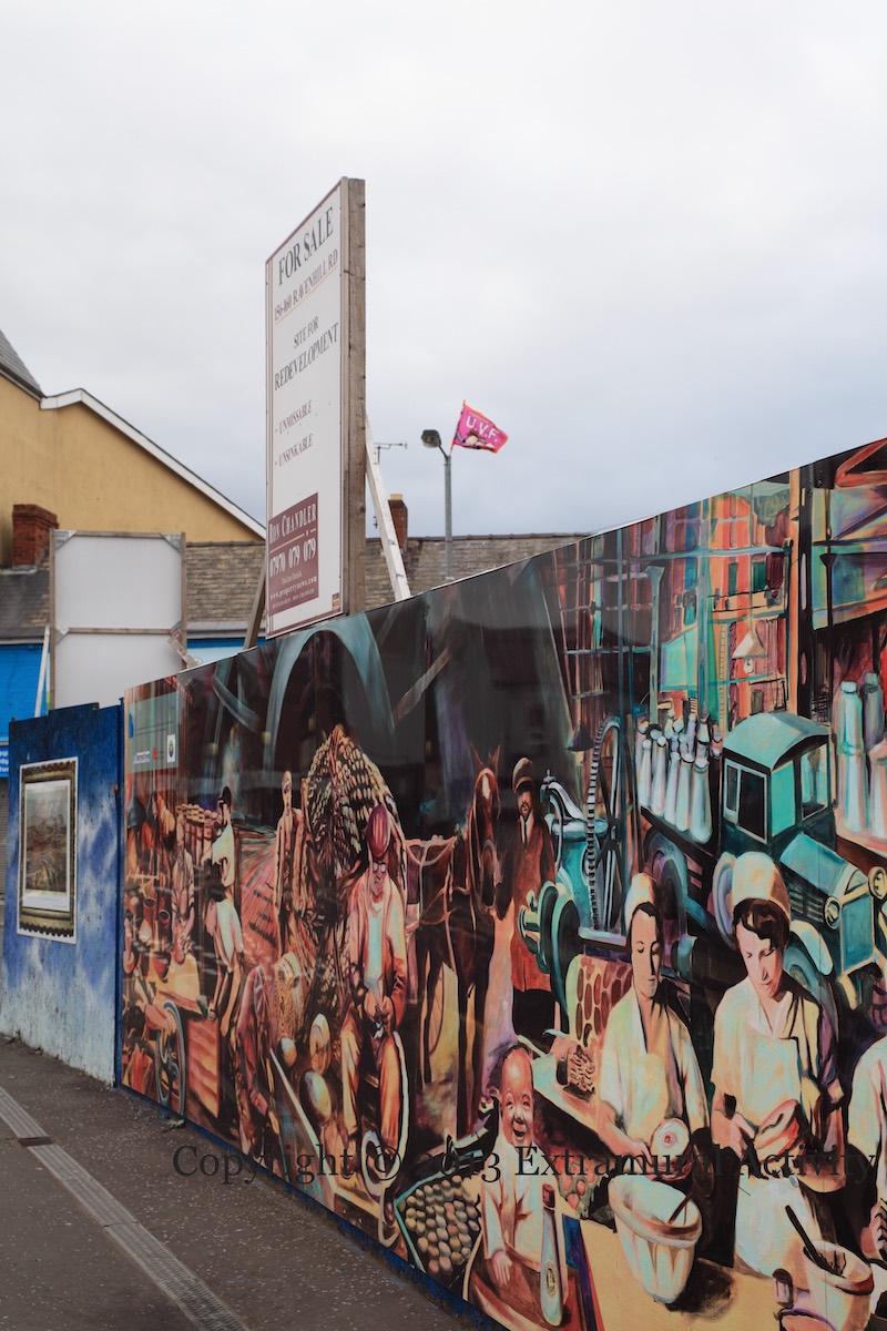 Various local industries of the past are named at the corner of My Lady’s Road and Ravenhill Road in east Belfast: Downshire Pottery [1787-1806], Ravenhill Iron Works [fl. 1910], Ridell And Sons [a grocer/trader in the 1800’s?], Tenants Textiles [probably the still-existing Tennants Textiles], Cromac Distillery [1776-1930], Belfast Vitriol Works [fl. 1852], Sydney Pentland [motor repair 1956-2005?]. An old (wooden) lamp-post in the foreground is painted in red-white-and-blue.