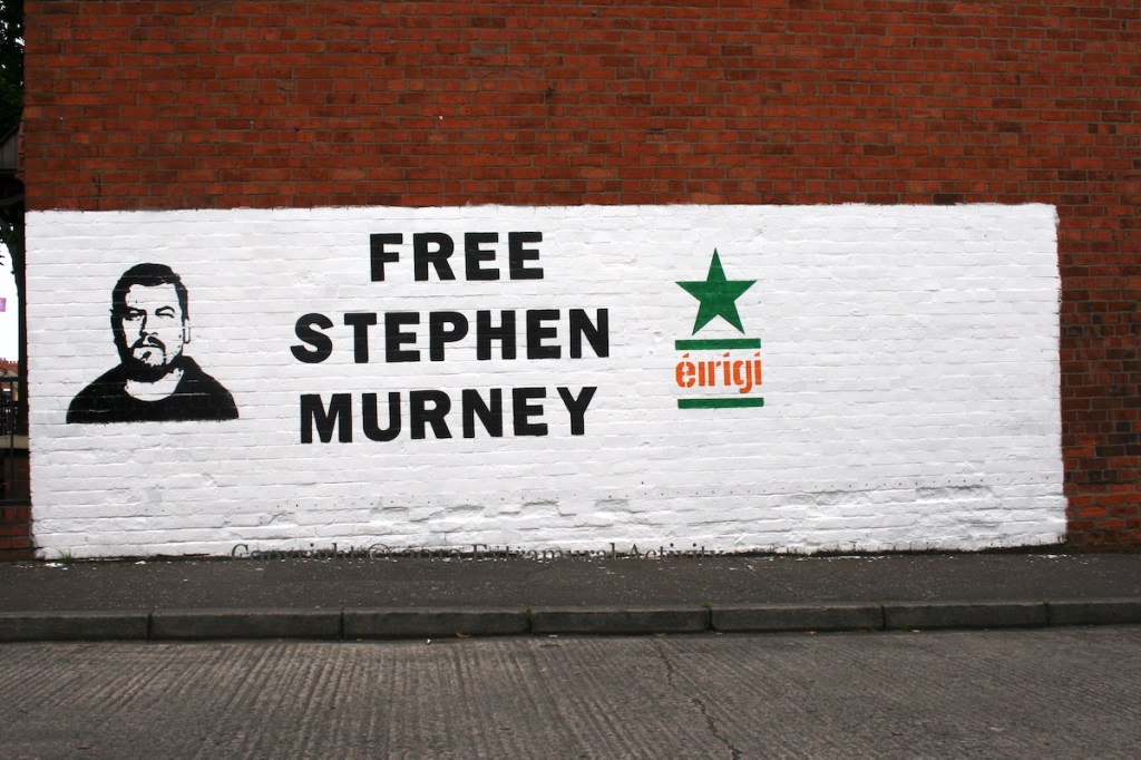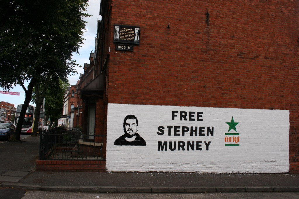 This is an Éırígí (web) stencil in support of their member Stephen Murney, who was arrested in November (2012) and subsequently transferred to Maghaberry on charges of supporting terrorism.