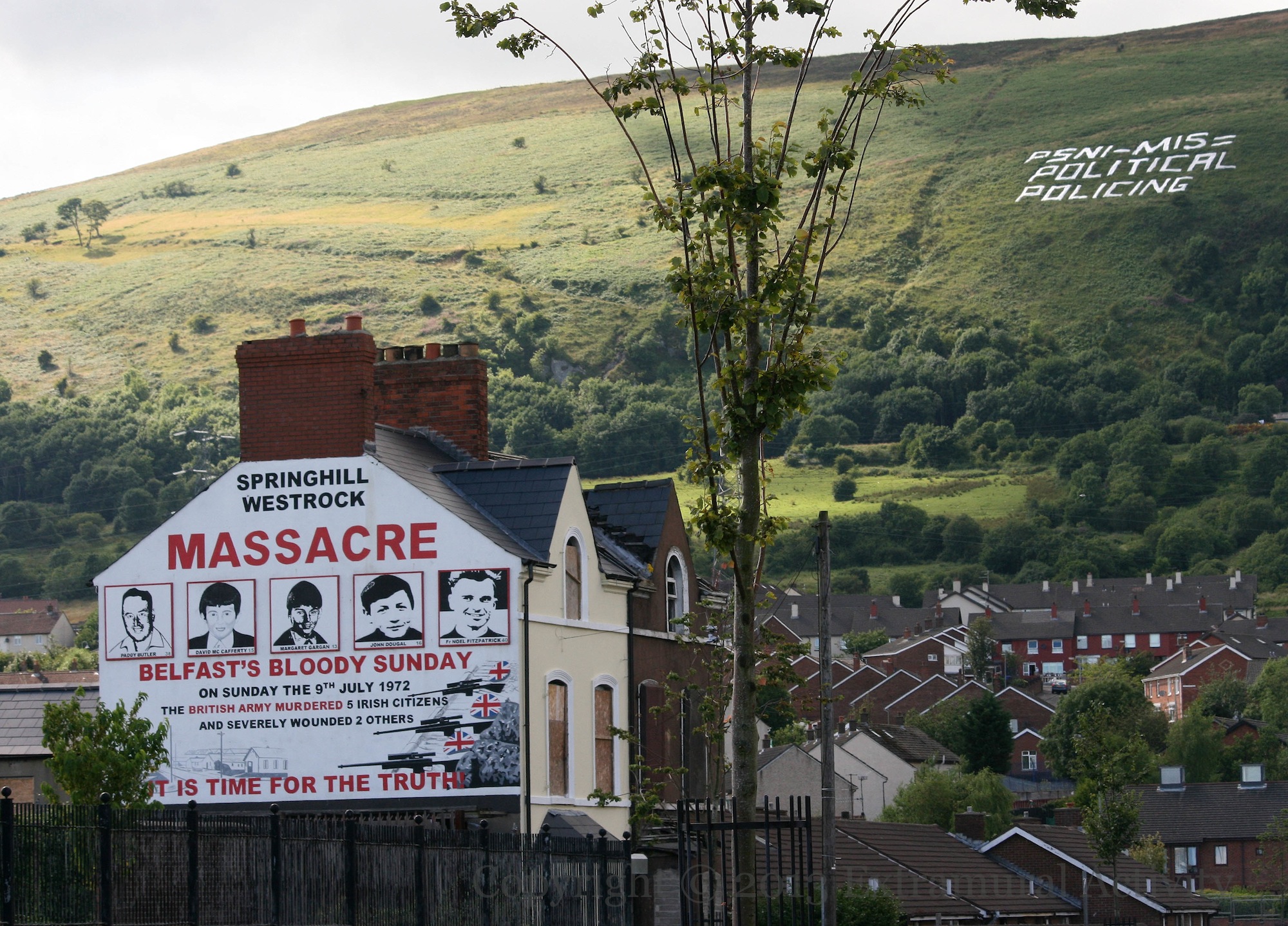Above is the latest political slogan to appear on Black Mountain, over New Barnsley and Ballymurphy: PSNI-MI5 = Political Policing, referring to the presence of British Military Intelligence in Northern Ireland. The Springfield Road barracks is in the right foreground. A close-up and the view from the other side of the road can be found below.
