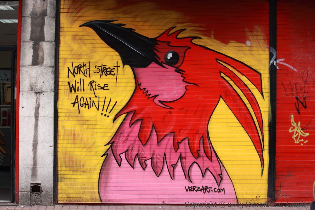 North Street Will Rise Again!!! 2013-08-102024-12-21Extramural Activity Street art by Verz (ig) making reference to the fire in the North Street Arcade – see Who Burnt Us Out?. Click image to enlargeCopyright © 2013 Seosamh Mac CoılleX01531 Rate ThisShare this: Click to email a link to a friend (Opens in new window) Email Click to share on Mastodon (Opens in new window) Mastodon Click to share on Reddit (Opens in new window) Reddit Click to share on Bluesky (Opens in new window) Bluesky Like Loading...