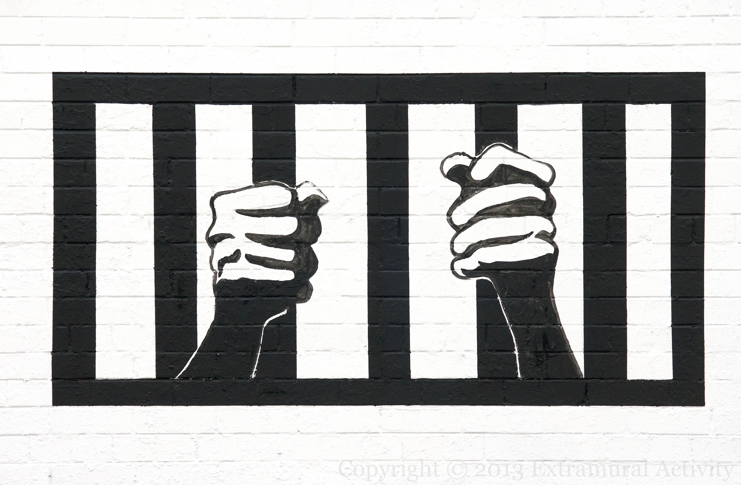 A new half-size (or 2/3rds-size) mural on the International Wall, Divis Street, in stark black-and white: End British Interment of Irish Republicans 2013. The mural was painted to coincide with the anti-internment march on August 9th that was routed through Belfast city centre and sparked violent protests (U.tv video reports).