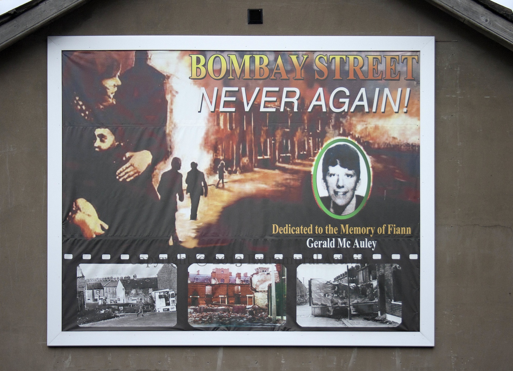 Printed and framed tarp in Bombay Street, commemorating the burning of Bombay Street during the August 1969 Belfast riots and the death Gerald McAuley, a young IRA member (Fian, not “Fiann” as written here) killed by a sniper during the trouble. Three photographs from the street at the time are reproduced in the bottom third of the board.