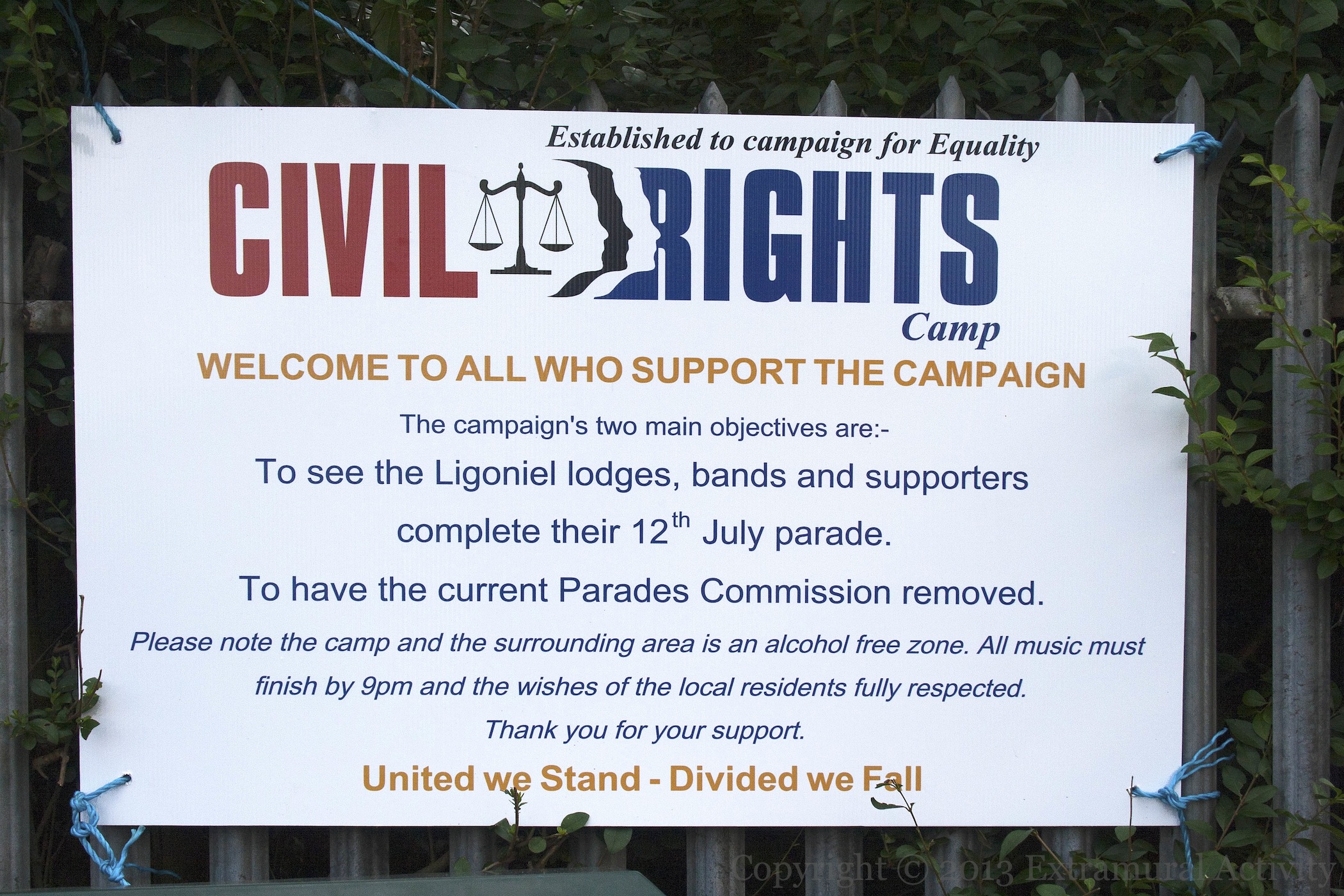 “Established to campaign for Equality. Civil Rights. Welcome to all who support the campaign. The two main objectives are to see the Ligoniel lodges, bands and supporters complete their 12th july parade; to have the current parades commission removed. Please note the camp and the surrounding area is an alcohol free zone. All music must finish by 9 p.m. and the wishes of the local residents fully respected. Thank you for your support. United we stand – divided we fall.”