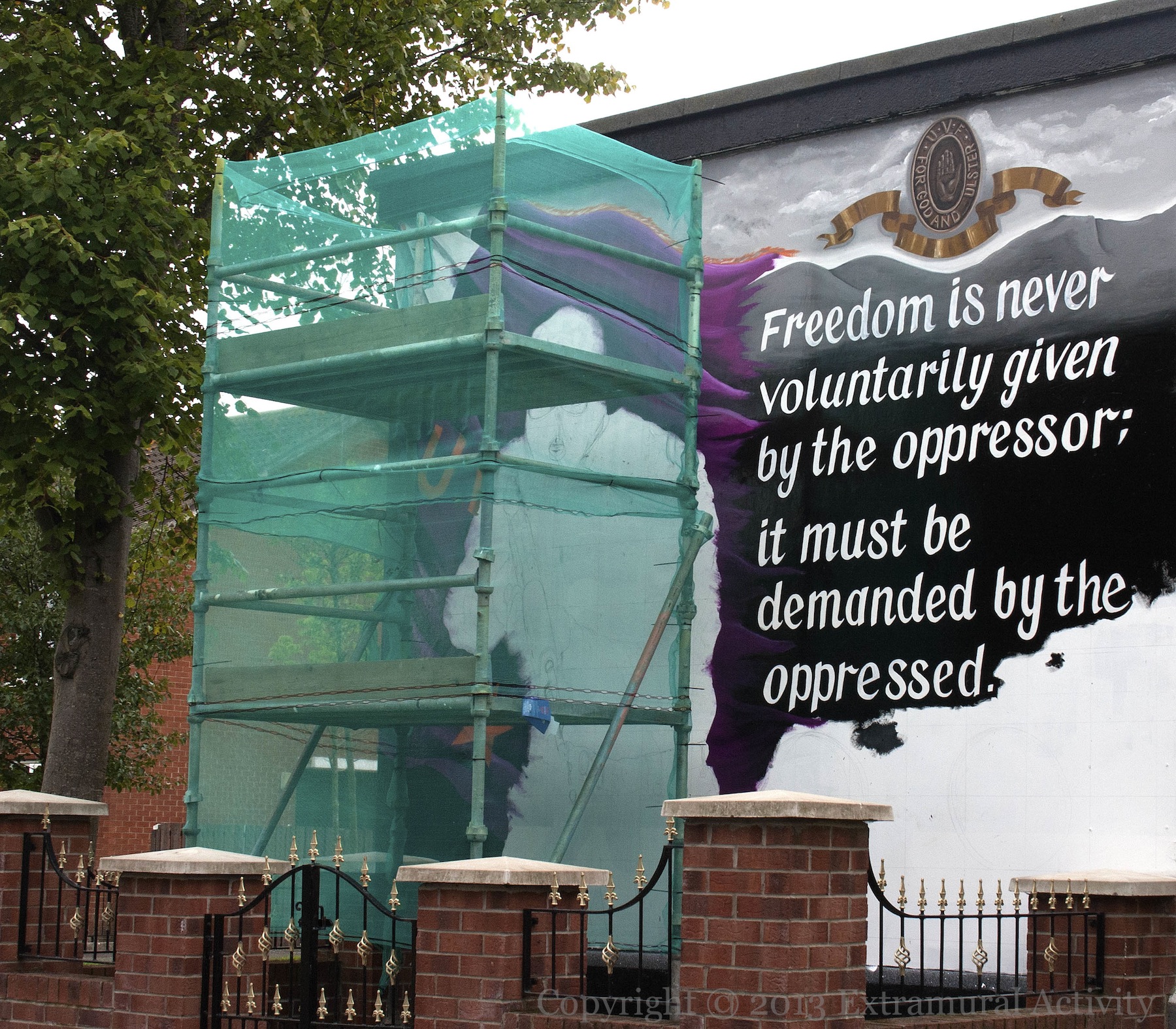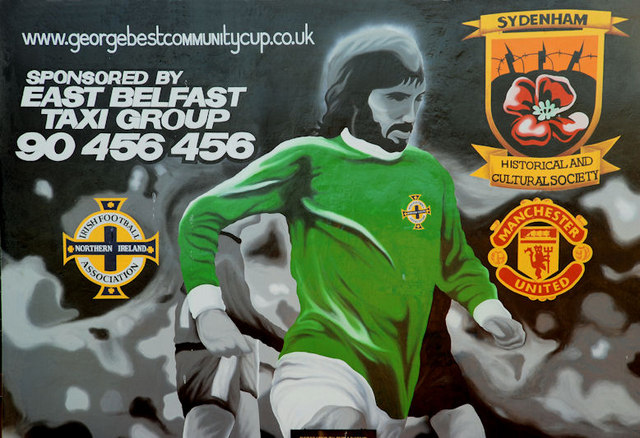 As reported in the media a week ago (BBC | Guardian | U.tv video | Slugger), an east Belfast mural featuring footballer George Best, which itself replaced a UVF mural, has been painted over and is being replaced by a new UVF mural. Progress on the piece, however, seems to have halted. This image shows the progress as of Monday 9th, showing no change since the 4th. The mural quotes Martin Luther King’s Letter From Birmingham Jail (pdf), drawing a parallel between the Civil Rights movement in the US and the situation of contemporary Protestants. Below is an image of the George Best piece, courtesy of the Geograph project.