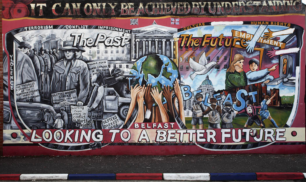 In this new east Belfast mural, we move from a part of “violence – terrorism – conflict – imprisonment’ to a future of ‘culture – empowerment – human rights – multiculturalism’. The mural is black-and-white on one side and colour on the other. On the left we have watchtowers and paramilitaries in hats and sunglasses; on the right schoolchildren in front of city hall, working on a computer and playing football.