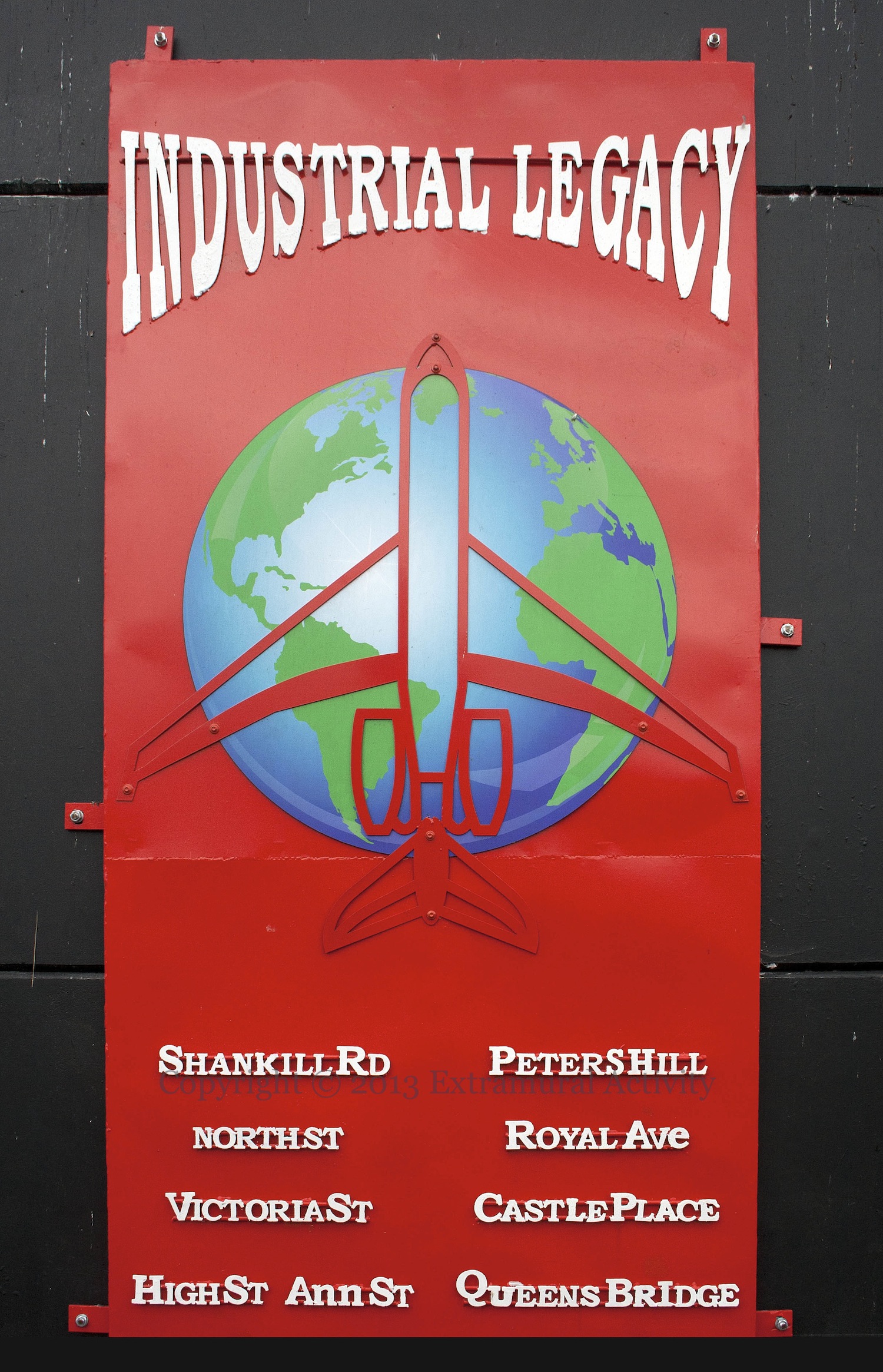 A fourth and final metal-work piece from the Cupar Way “peace” line shows an aeroplane in outline over a globe and gives a list of various Belfast streets which were formerly industrial centres: Shankill Rd., North St., Victoria St., High St., Ann St., Peters Hill, Royal Ave., Castle Place, Queens Bridge. A wide shot of all (one | two | three) four pieces (as well as Let Go Of The Past and 3 R’s) can be found below.